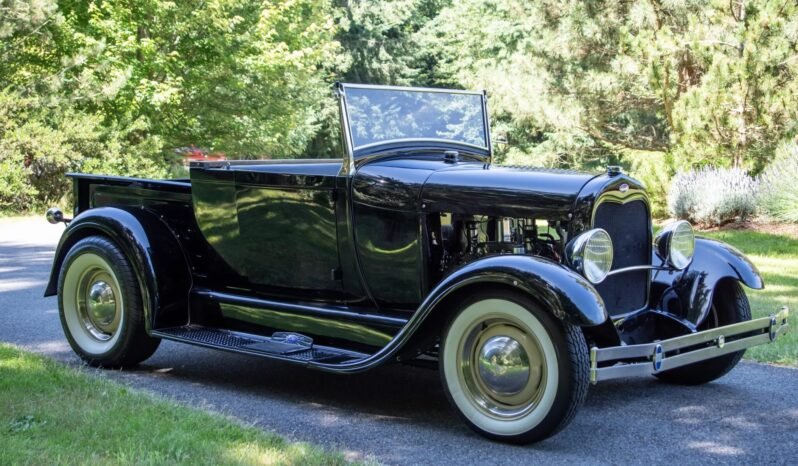 Additional equipment includes a three-speed manual transmission, a custom dashboard, and more. The steel bodywork and fenders have been refinished in black, while the bed is lined with wood slats and stainless steel runners.