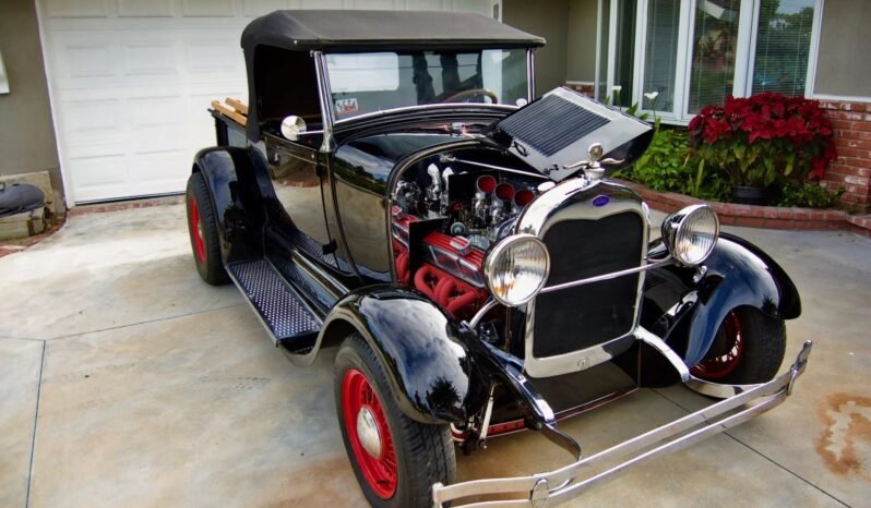 The bed features varnished wood slats with matching stake sides. Red-painted wire wheels wear Ford V8 hubcaps and feature larger tires at the rear.