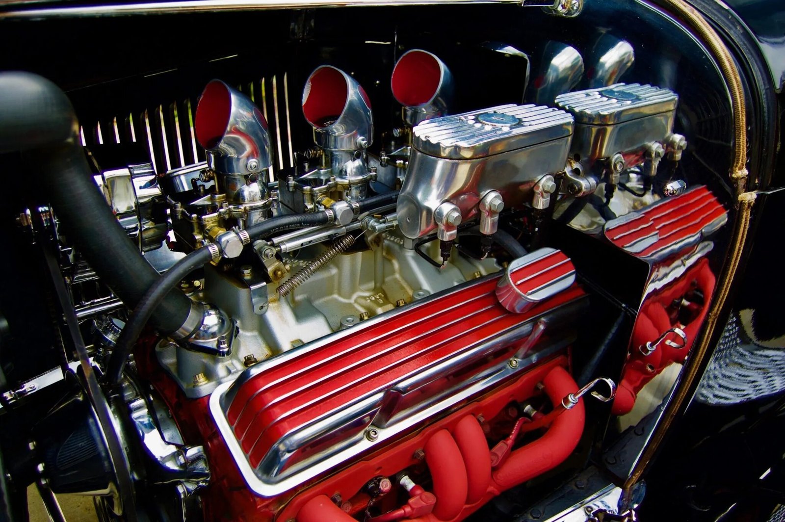 Power is from a 327ci Chevrolet V8 equipped with triple Stromberg carburetors on an Edelbrock intake manifold and mated to a three-speed automatic transmission.