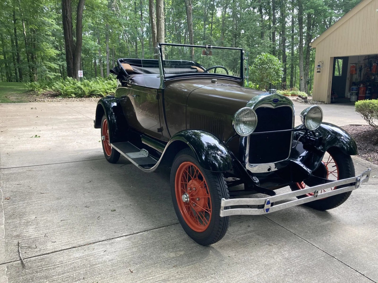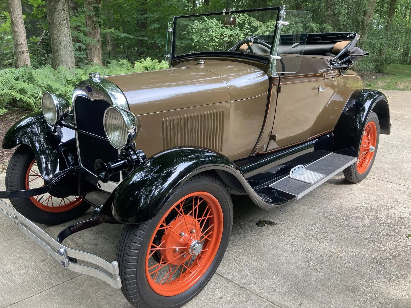 This 1929 Ford Model A Roadster is powered by a replacement 201ci L-head inline-four paired with a three-speed manual transmission and is refinished in brown over brown vinyl. Equipment includes a dark brown convertible top, 21″ wire-spoke wheels, a tilt-out windshield, a rumble seat, and a rear-view mirror.
