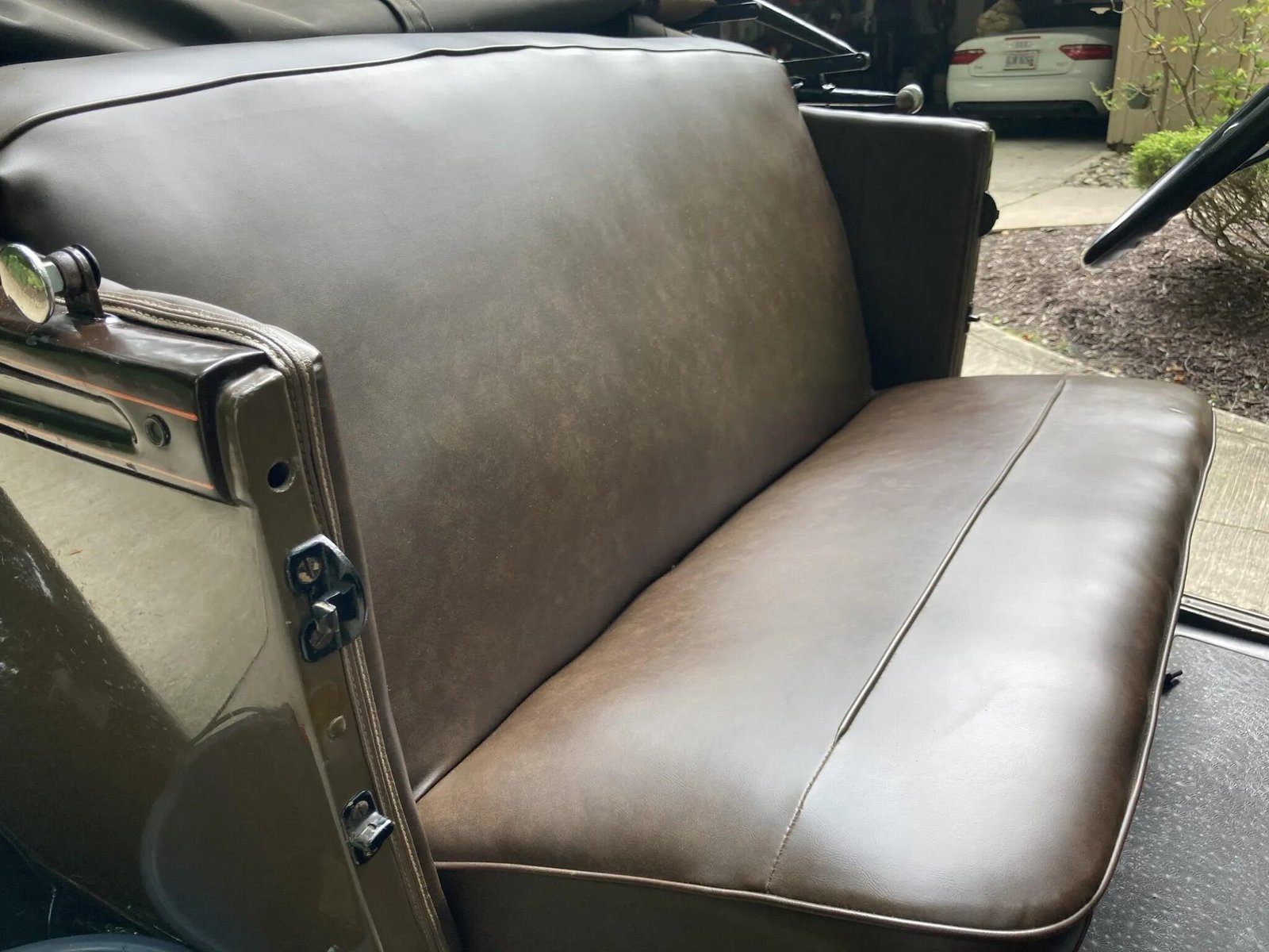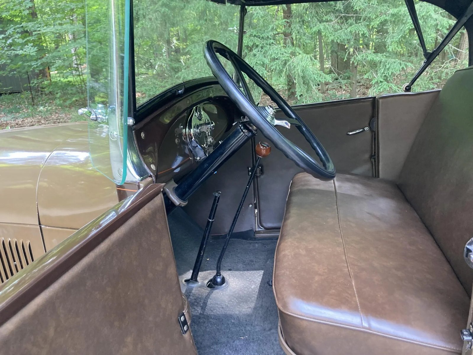 The cabin features a bench seat upholstered in brown vinyl, while the rumble seat is upholstered to match. Interior appointments include a horn, a rear view mirror, and a rubber floor mat.