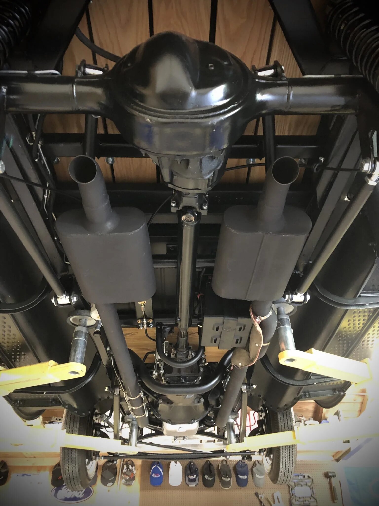 The 32-spoke wire wheels are finished in black, feature chrome hubcaps, and are mounted with 550–16 front and 750–16 rear Firestone bias-ply tires in a big-and-little setup.