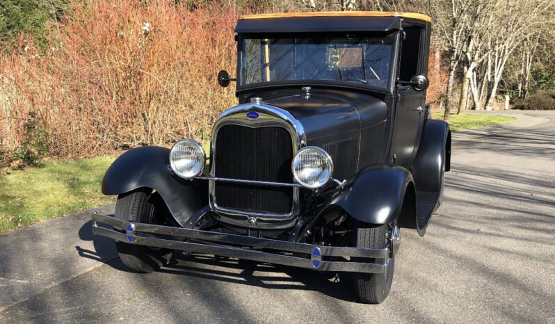 Body filler is noted, and features include dual 1932 Ford taillights, red oak bed slats, green-tinted glass, a tilting windshield, a driver-side windshield wiper, a Klaxon-style horn, and a chrome radiator surround.