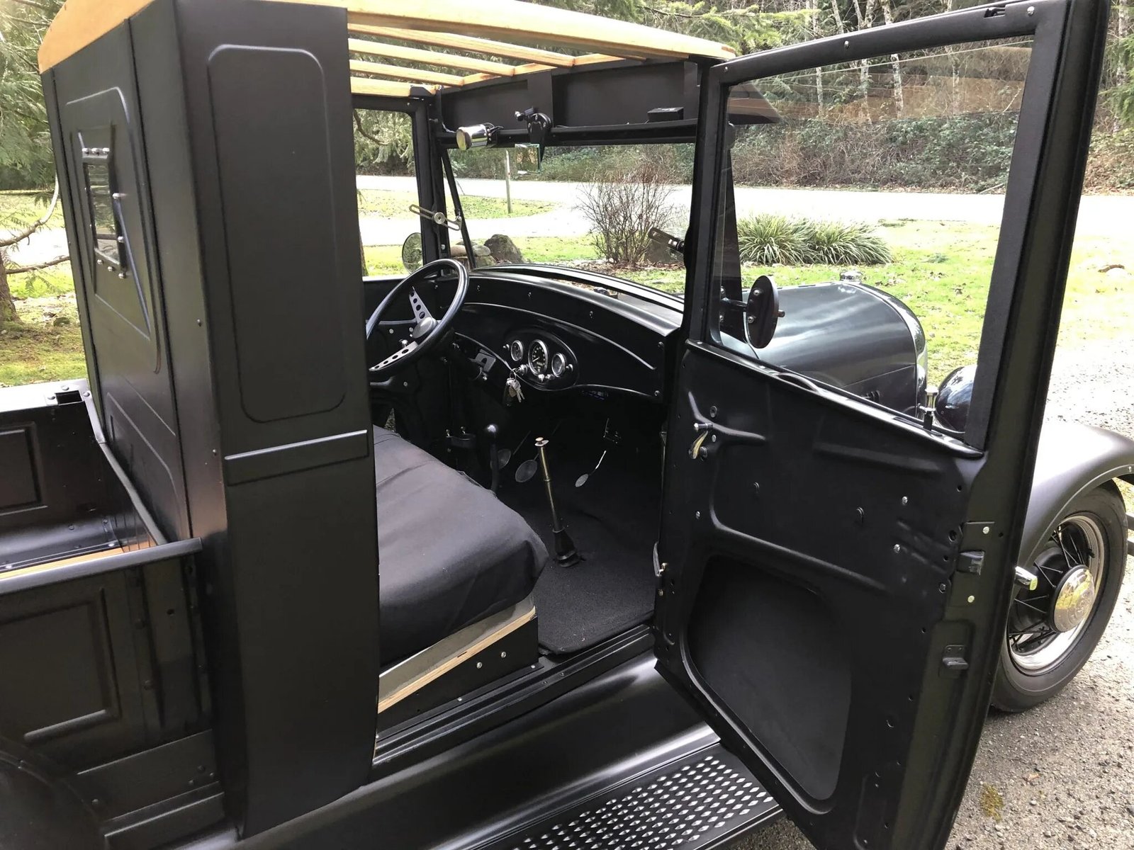 The bench seat features black canvas upholstery, and a matching carpet is fitted over red oak floorboards.