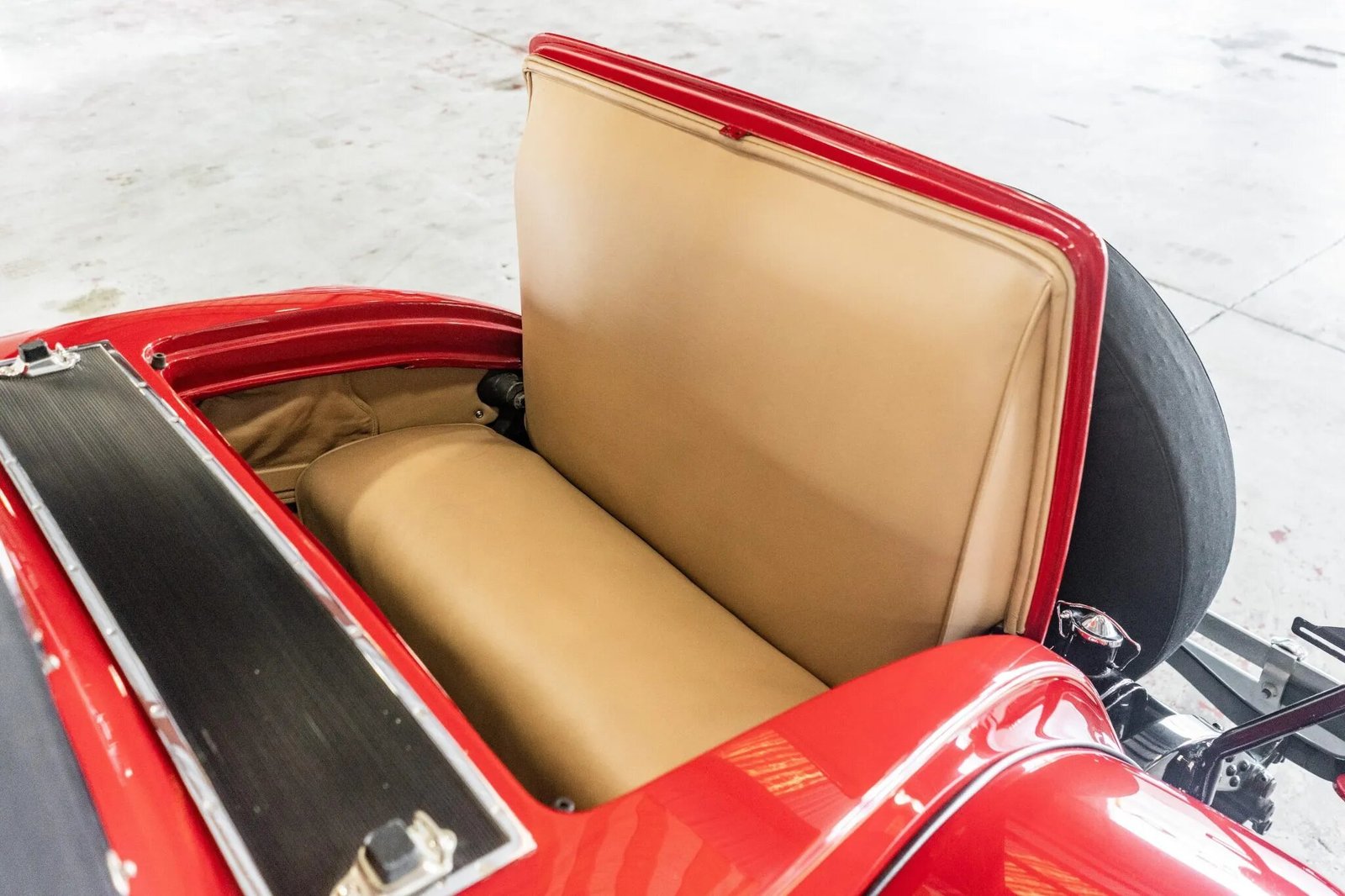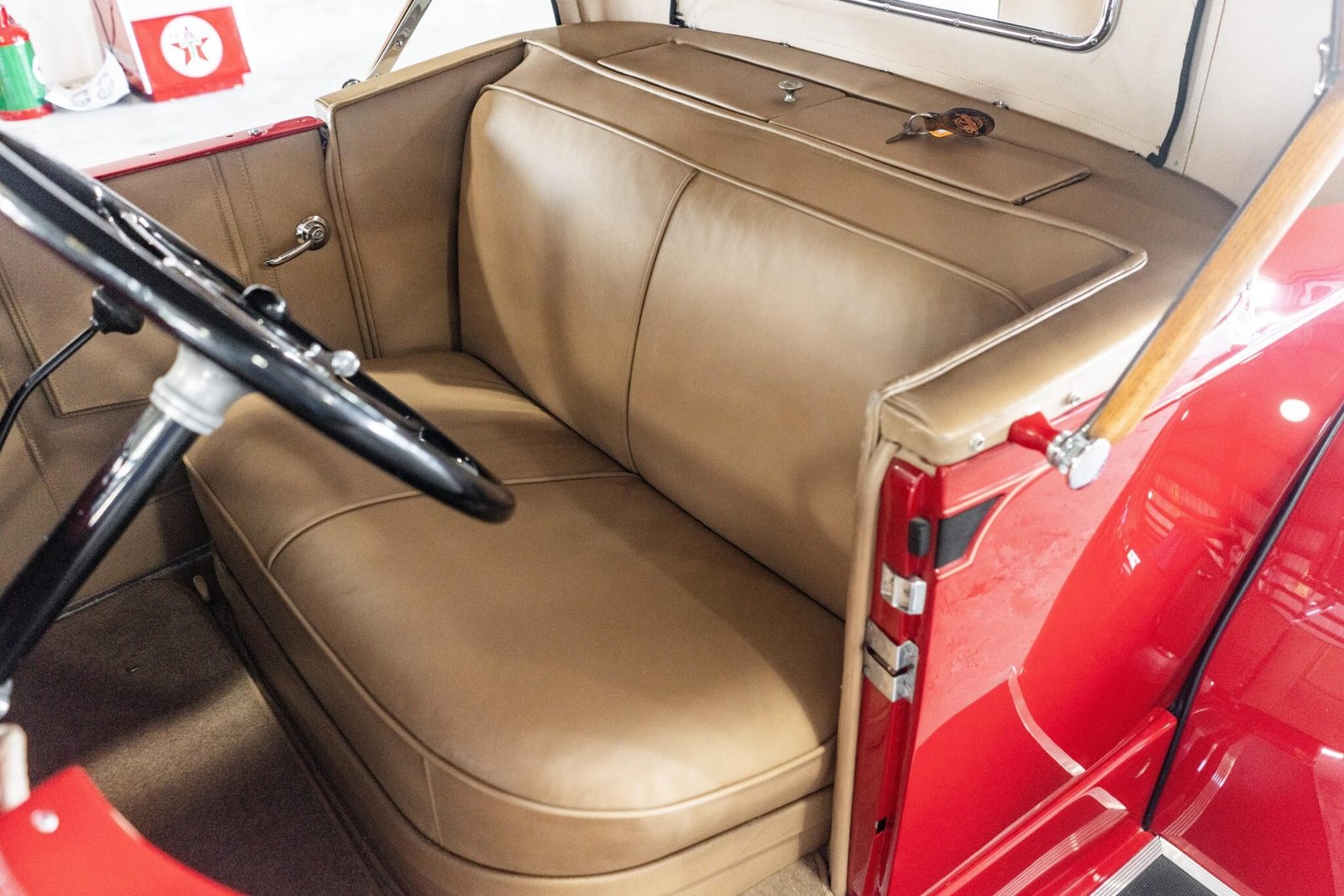 This example was disassembled and stripped to bare metal before it was repainted Crimson Red during the refurbishment. Equipment includes front and rear bumpers, a bright radiator shell, a Goddess of Speed radiator mascot, quadruple vents on each side of a centrally hinged hood, a tilt-out windshield, running boards, a black Stayfast top, and a single taillight cluster. Pebble Beach Concours d’Elegance and Packard Club badges are affixed to the front bumper.