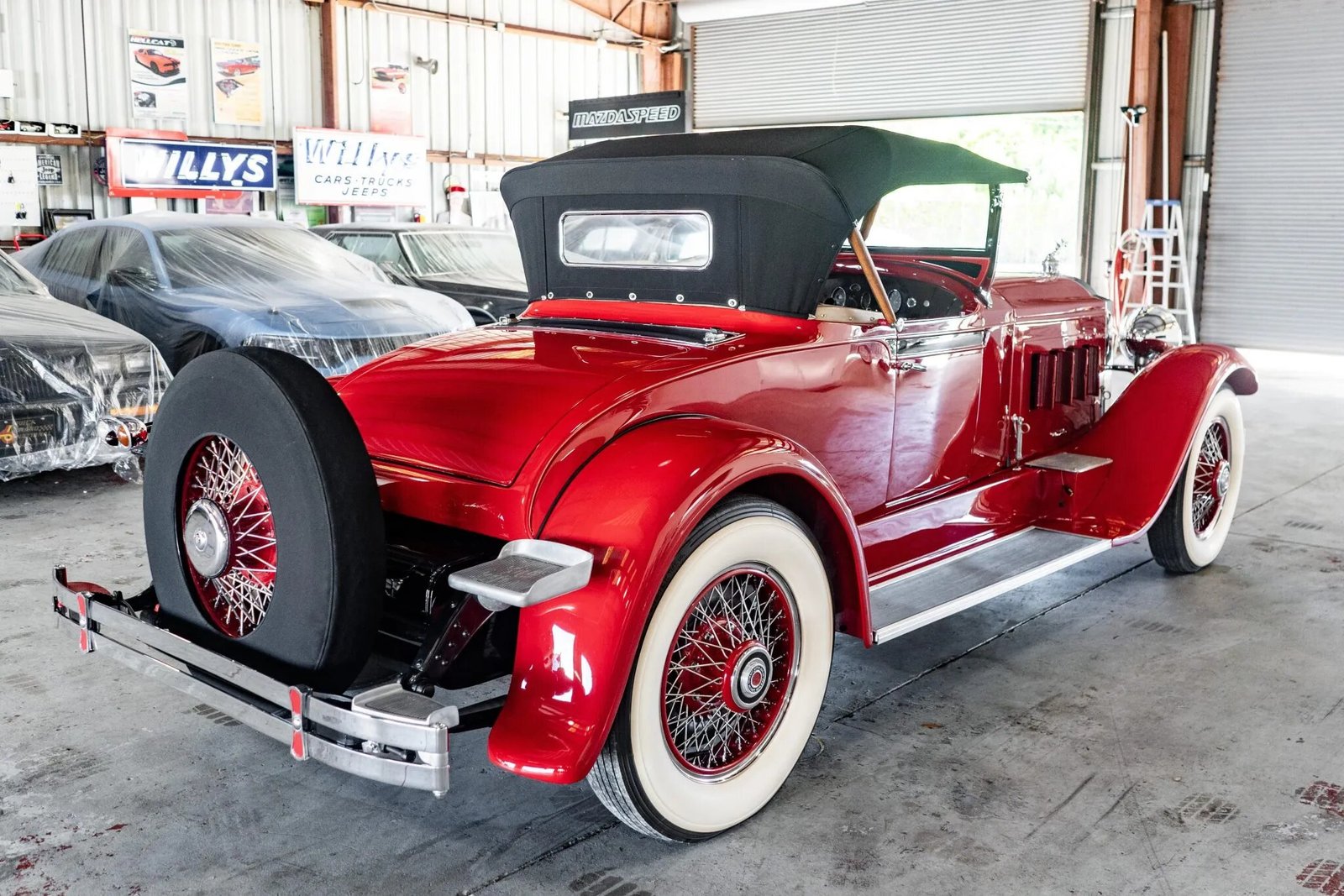 The Speedster was developed by Packard chief engineer Jesse Gurney Vincent, who constructed four prototypes in 1927. The first production model, the 626 Speedster, featured Model 640 Custom Eight bodywork that was shortened by 14″ and restyled by Vincent D. Kaptur and Werner Gubitz. It was mounted on a Standard Eight 126″ wheelbase chassis along with a revised 384.8ci L-head straight-eight sourced from the Custom Eight lineup. Offered with both Roadster and Phaeton bodywork, approximately 70 Speedsters were produced for the model year.