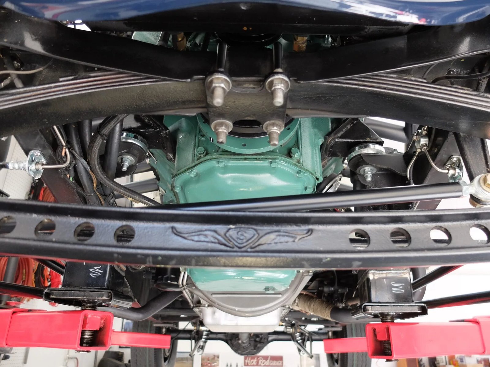 Front brake components were replaced in preparation for sale, and the steering and suspension have been modified and features the following components: Dropped and drilled Super Bell front axle, Walden Speed Shop alloy front hubs with Ford spindles, SoCal Speed Shop front Panhard bar, Ford Mustang–sourced steering box, QA1 adjustable rear coilovers, Rear Panhard bar and ladders bars.