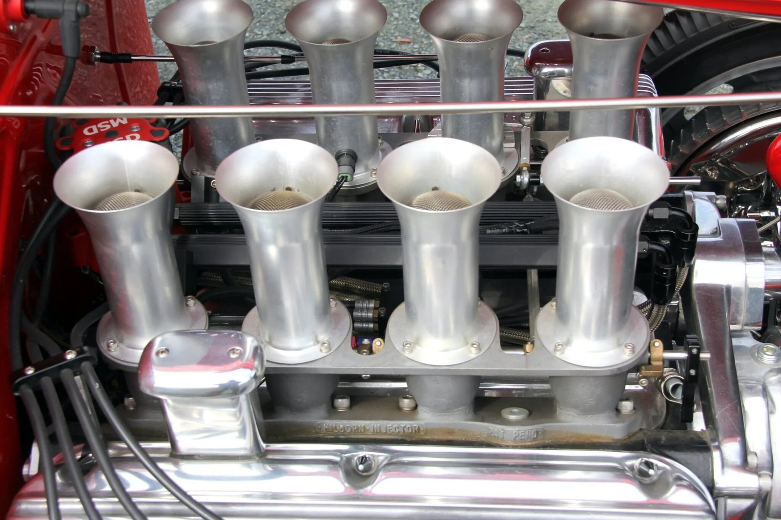 The 392ci Chrysler Hemi V8 was rebuilt at Peckham Precision Engines, where work included boring the engine .030″ over and fitting it with Hilborn electronic fuel injection, a Hot Heads full-flow oiling system, a street camshaft, and a big block Chevrolet water pump with an aluminum crossover.
