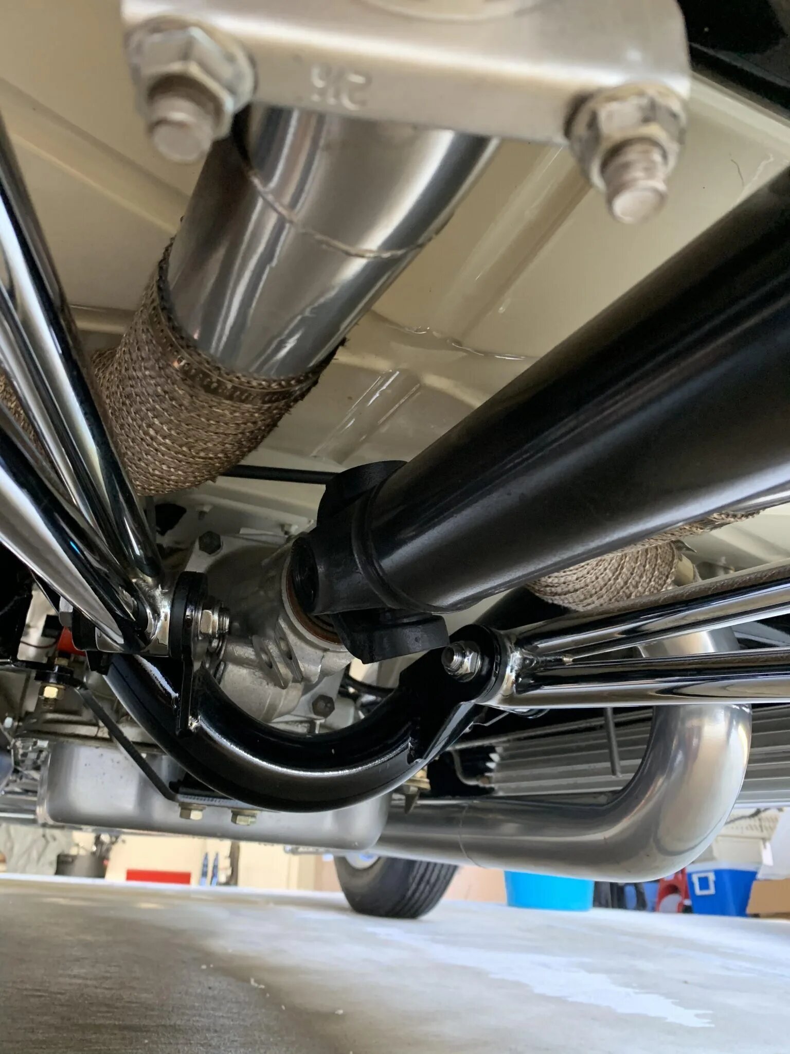 Chrome-plated suspension components include the front drop axle, the front leaf spring, front spindles, front shocks, ladder bars, and the steering links.