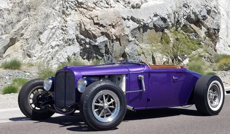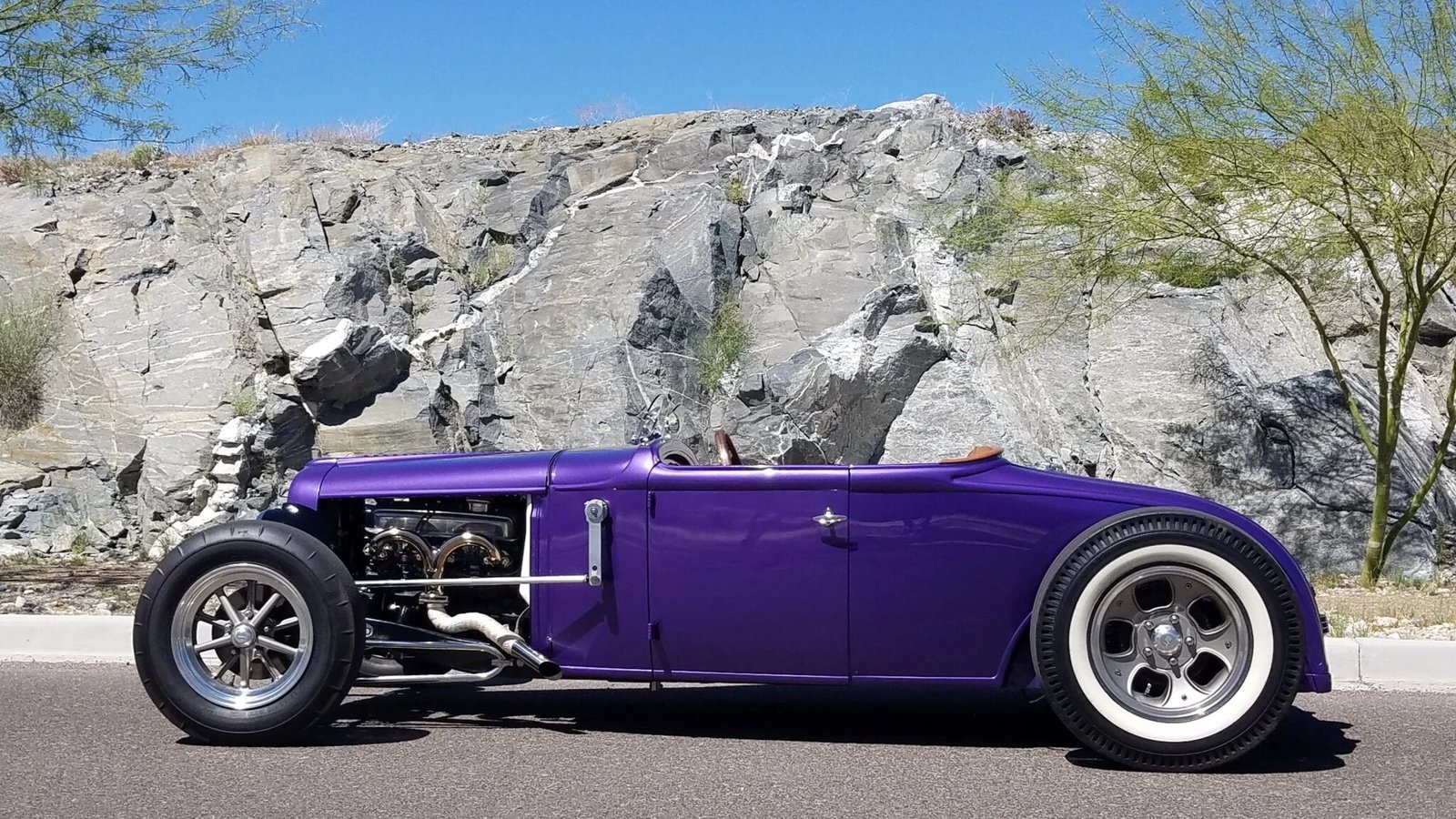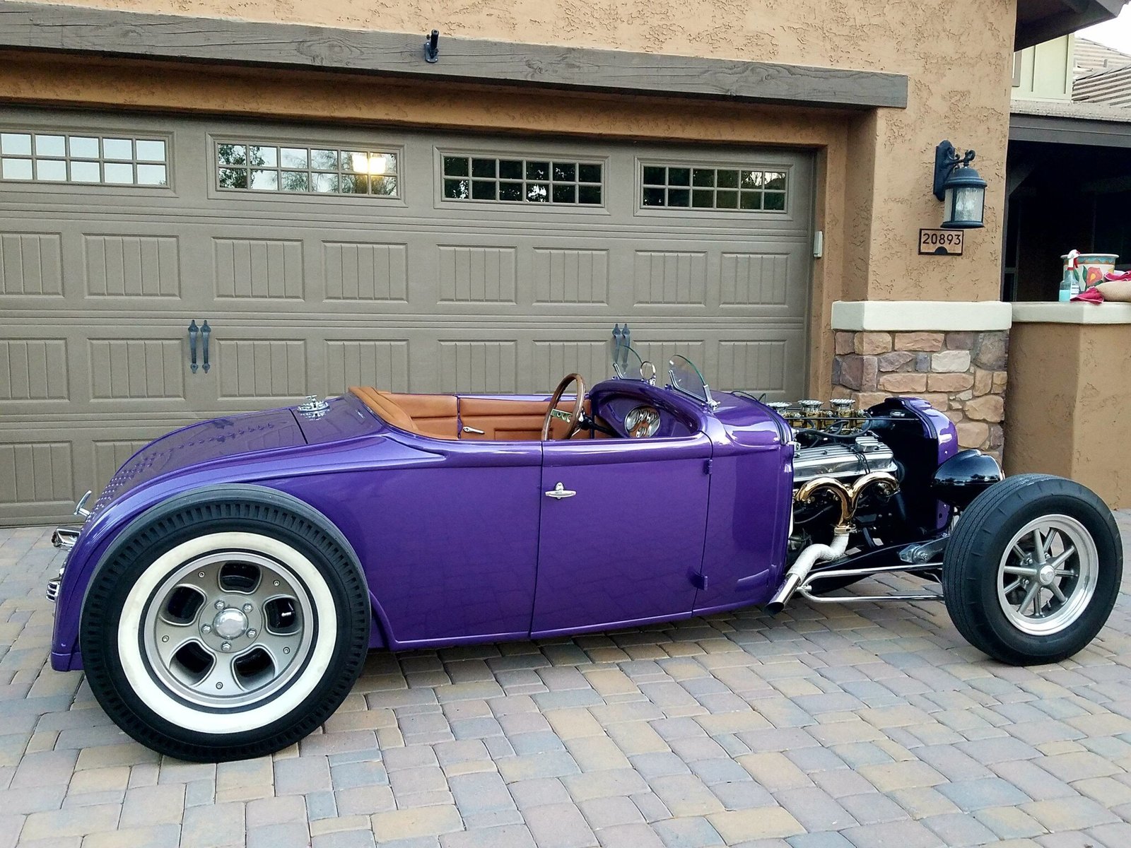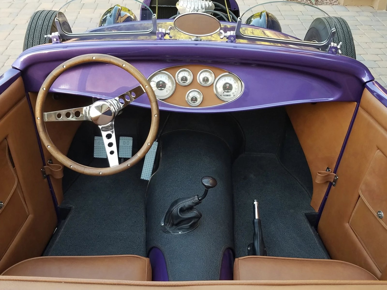 The build started with a steel 1931 Model A roadster, and work included modifying the frame and refinishing the exterior in purple along with the installation of a 305ci Chevrolet V8, a Tremec 5-speed manual transmission, front disc brakes, a rear coil-over suspension, and a tan leather interior.