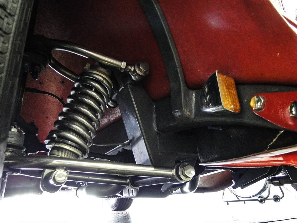 Heading underneath the car you will be happy to find a modern style front end with adjustable tubular control arms, rack and pinion steering, power disc brakes and Aldan adjustable coil over shocks.