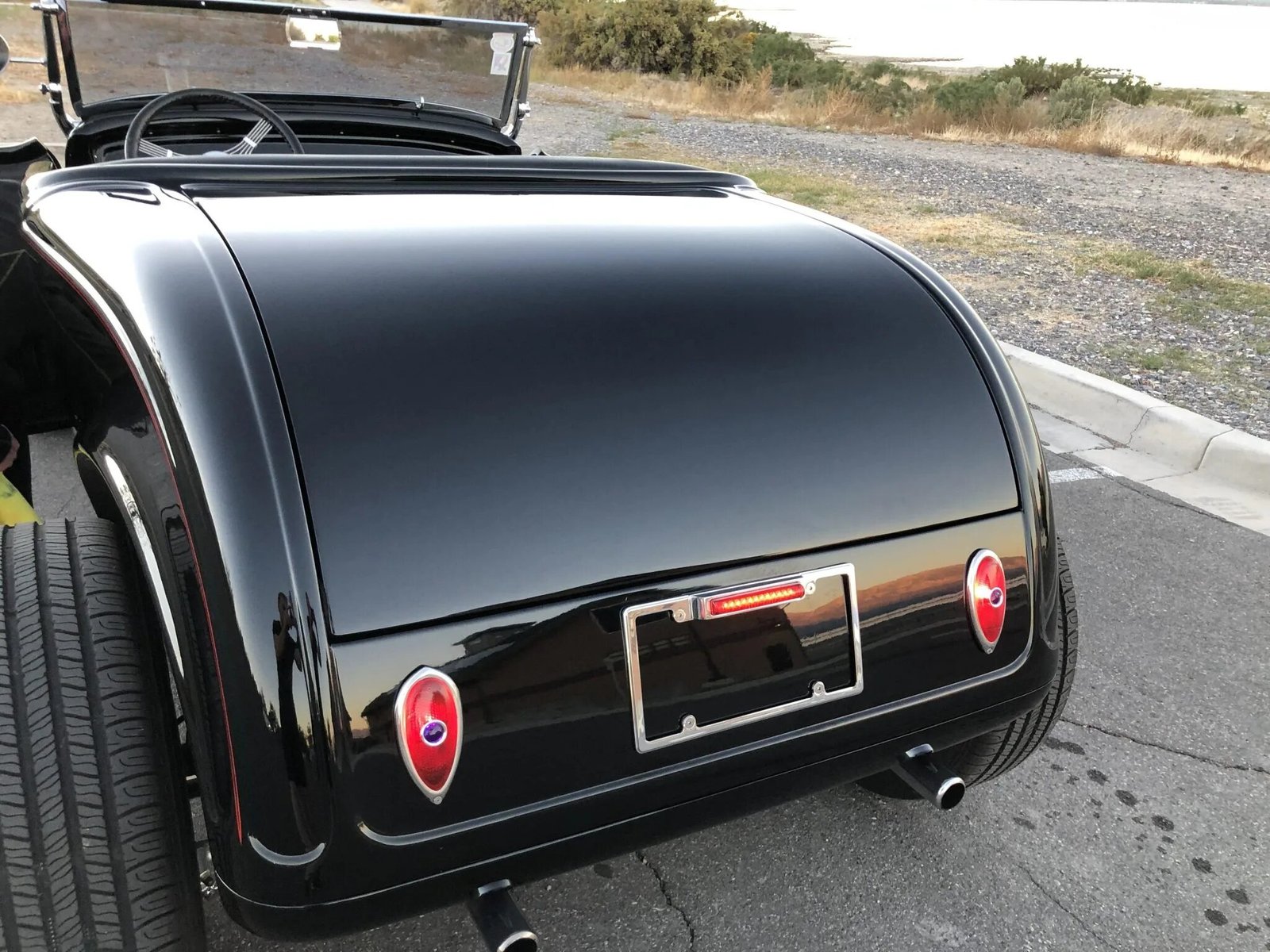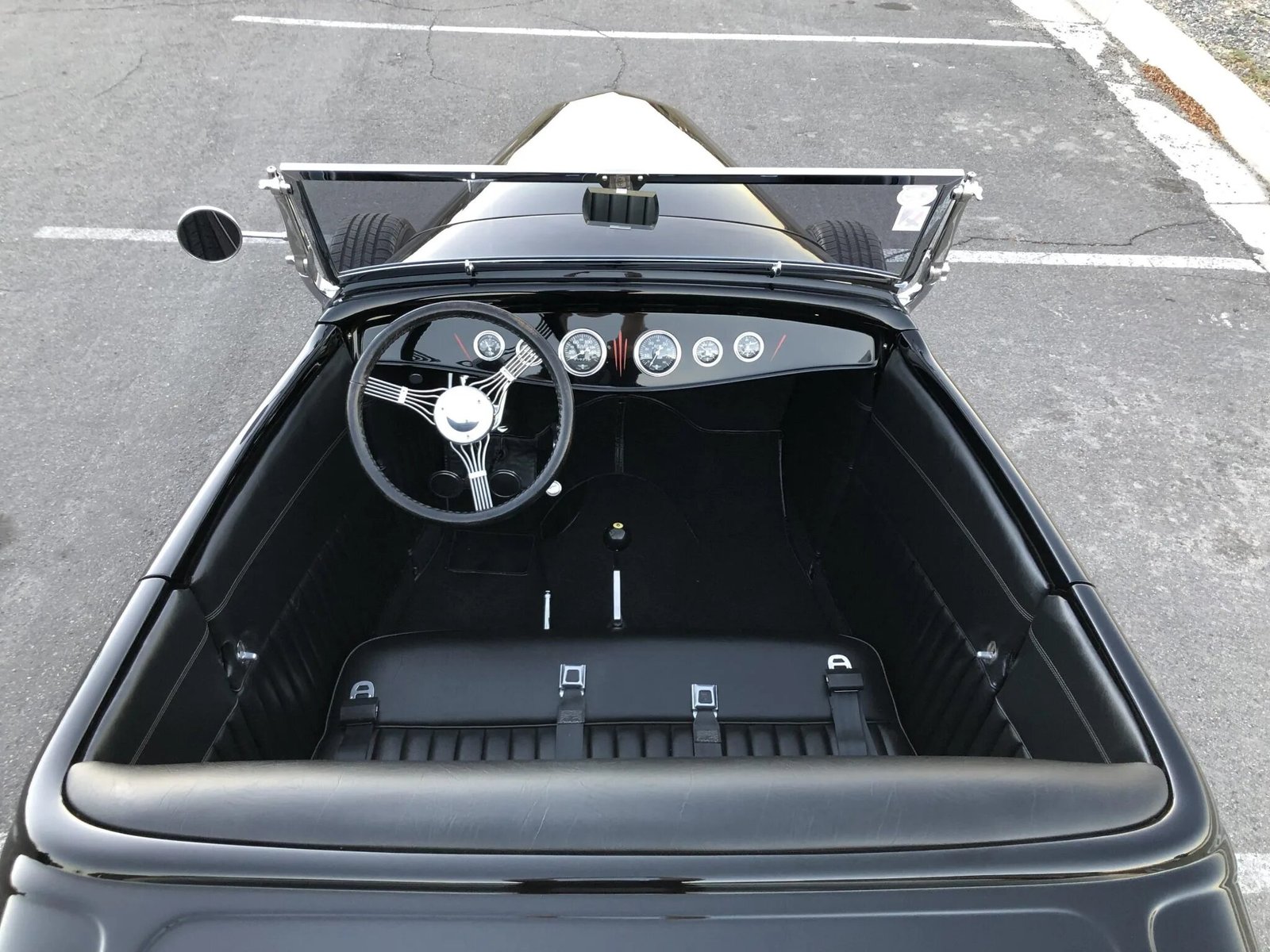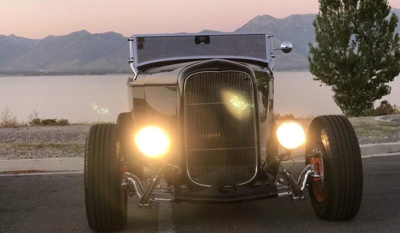 The car features a Harwood fiberglass 1932 Ford body finished in black over matching vinyl tuck-and-roll upholstery, and power comes from a flathead V8 paired with a five-speed manual transmission and a Ford 9″ rear end.