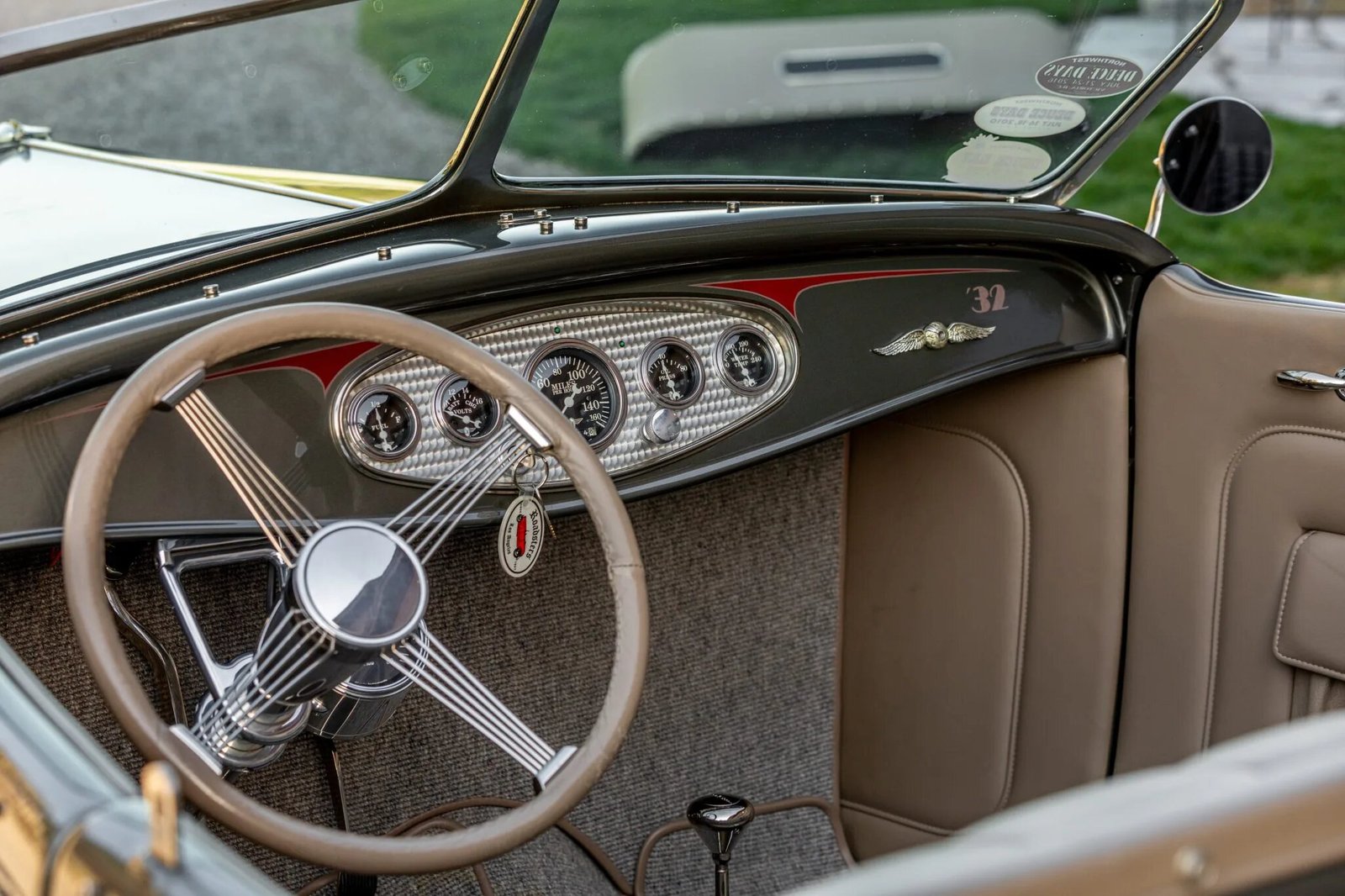 Additional features include a removable tan soft top, nickel-plated bright finishes, a Rootlieb louvered hood, a DuVall-style split windshield, Dietz headlights with So-Cal Speed Shop brackets, 1948 Chevrolet–sourced taillights, and chrome side mirrors.