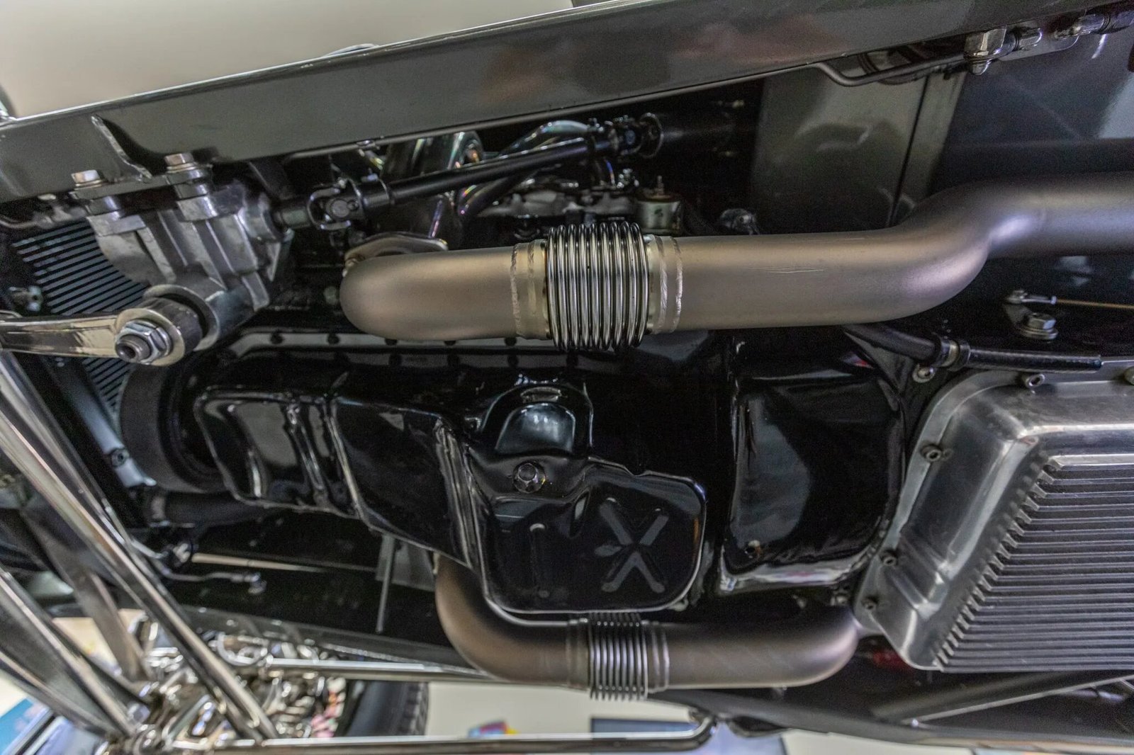 A Chassis Engineering dropped I-beam axle and So-Cal Speed Shop shock mounts are shown fitted up front, and an Earl’s remote transmission cooler is mounted centrally beneath the car.
