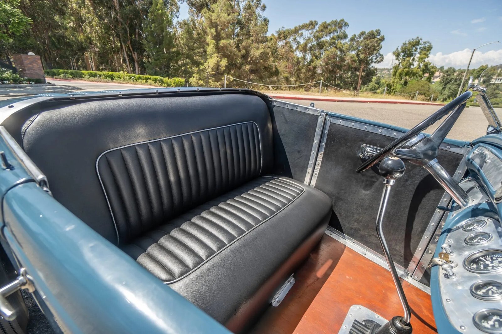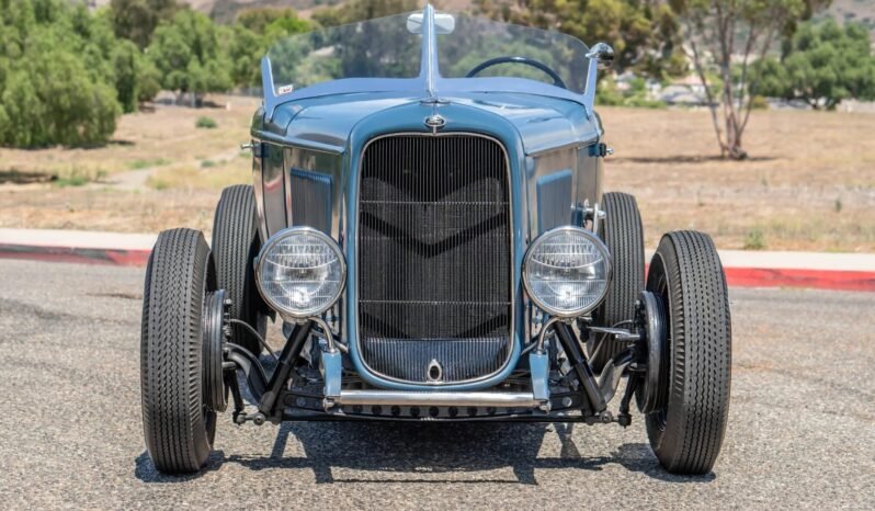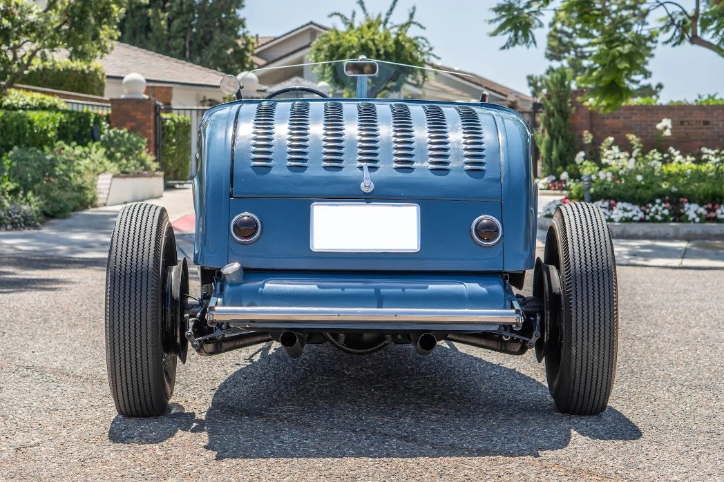 The car was turned into a hot rod, and the door skins were replaced and the quarter panel patched before it was repainted in blue. A custom V-shaped windshield has been added along with a louvered trunk lid. Stainless-steel headlight assemblies with integrated LED turn signals were installed.