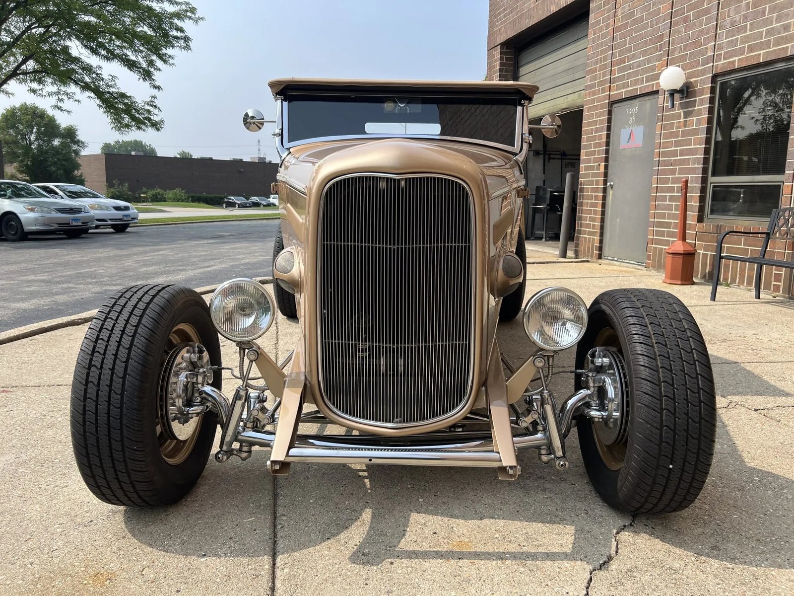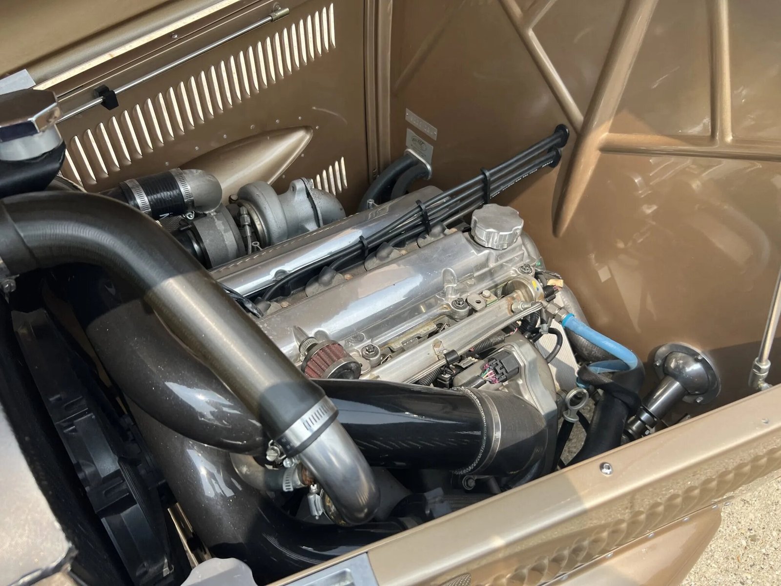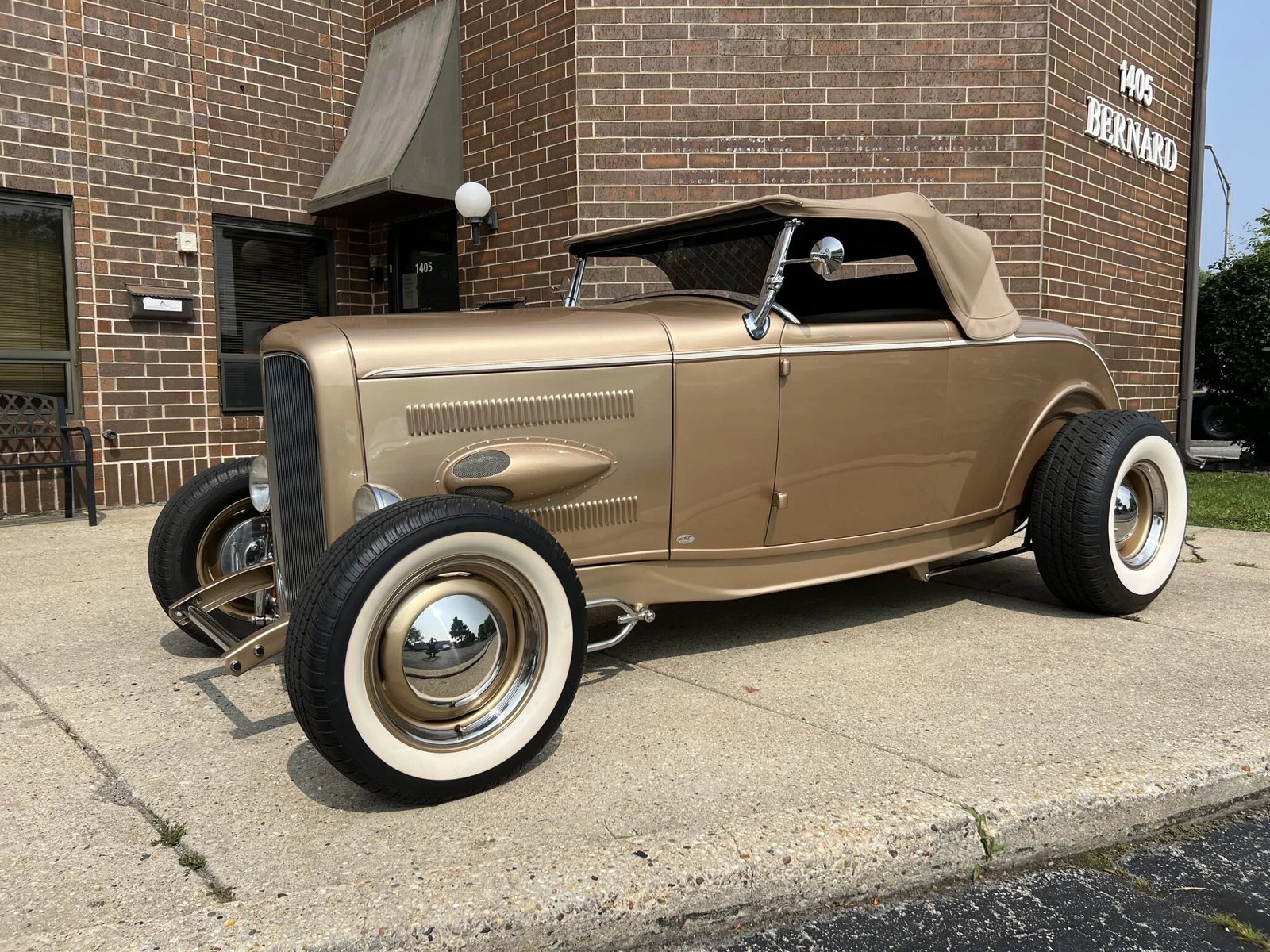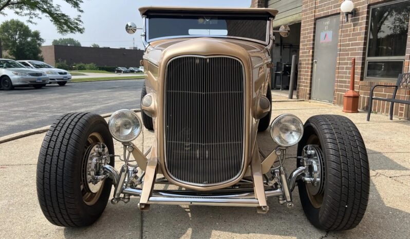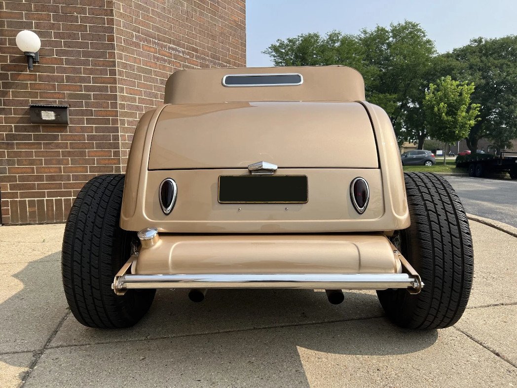 This ’32 Ford hot rod was built by Noone Customs utilizing a steel roadster body from Denver Deuce and a TCI frame. The car is powered by a turbocharged 2.4-liter Ecotec inline-four mated to an Aisin five-speed manual transmission, and the build also incorporates four-wheel disc brakes, body-color 15″ wheels, a dropped front axle, and a 9″ rear end with coilovers. The interior is upholstered in two-tone beige and gold leather and features a banjo steering wheel, seatbelts, engine-turned instrument panels, and AutoMeter gauges.