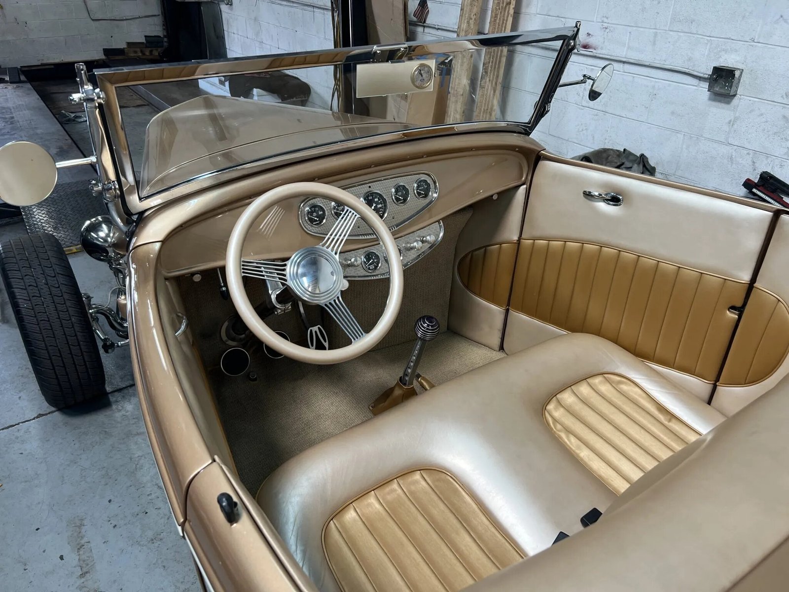 The cabin features a bench seat upholstered in beige leather with gold inserts. The door and side panels are upholstered to match, and additional equipment includes a banjo-style steering wheel, lap seatbelts, and a rearview mirror with an inset clock.