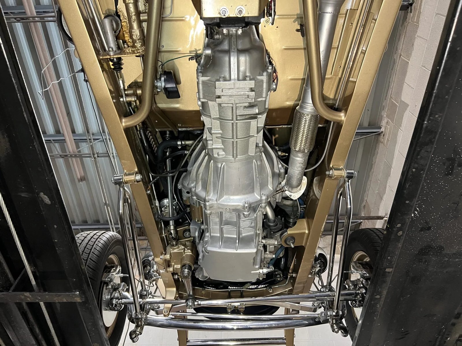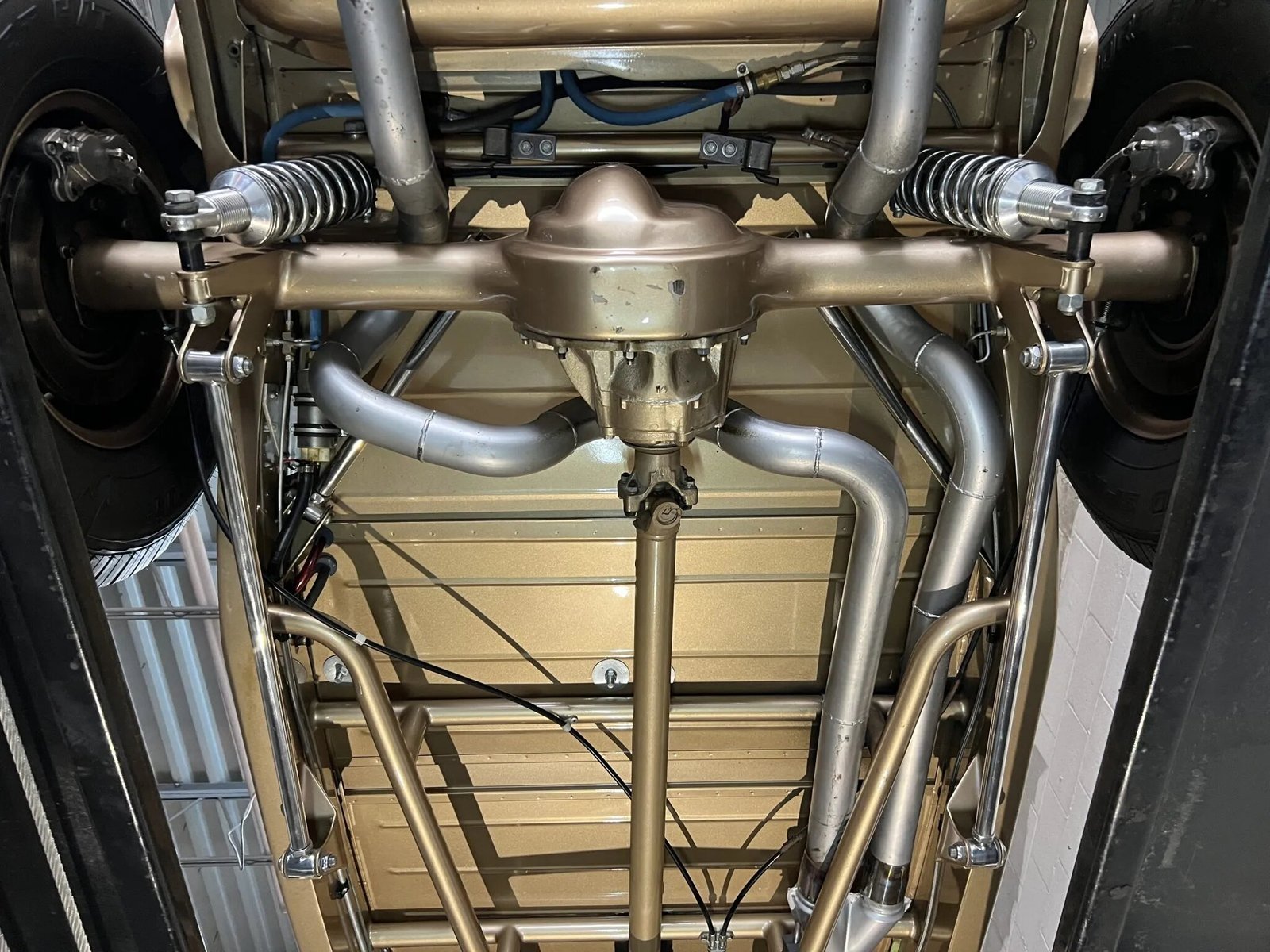 The 15” wheels are finished in gold and wear chrome hubcaps along with whitewall tires measuring 205/65 up front and 265/75 out back. The dropped front axle is equipped with hairpin radius rods and a transverse leaf spring, while adjustable coilovers are fitted out back. Braking is provided by vented discs at all four corners.
