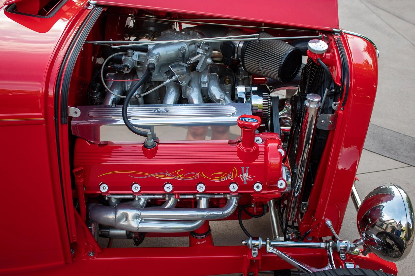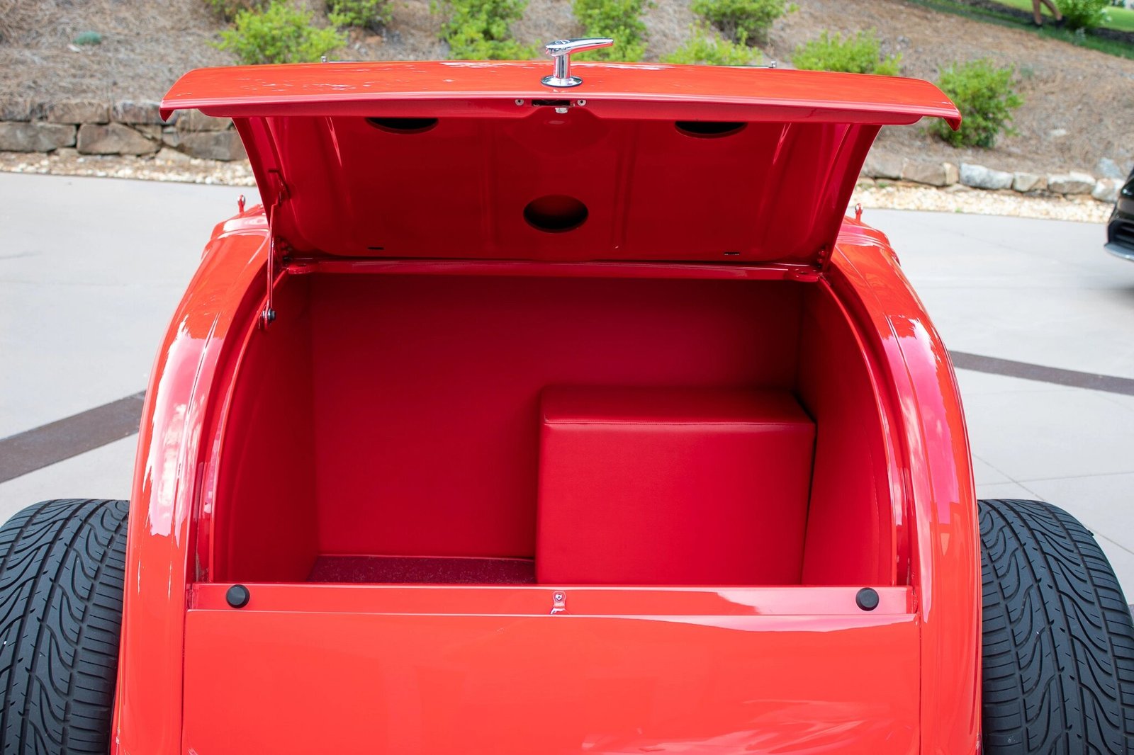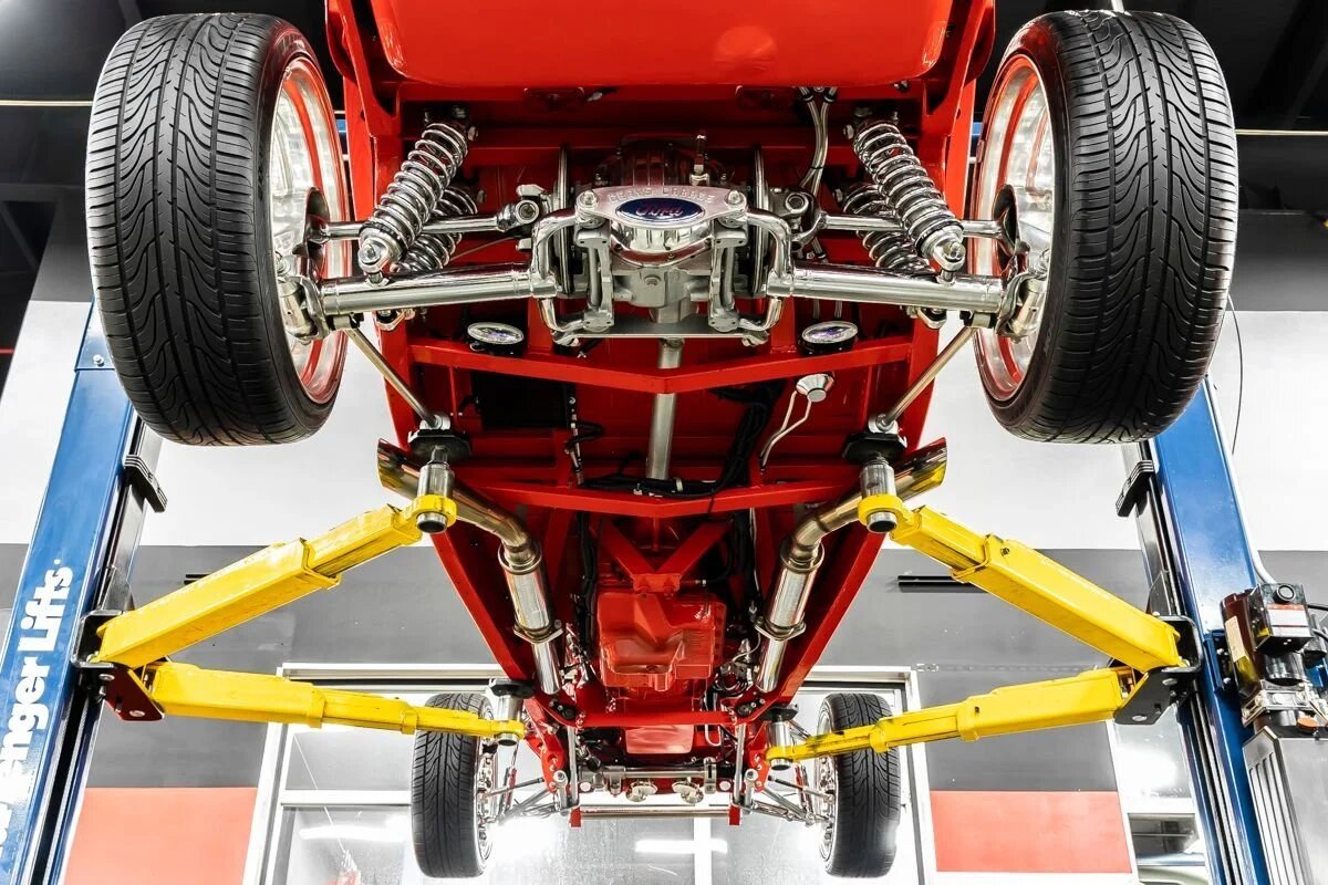 The steel Brookville Roadster body is finished in red with yellow and gray pinstriping and is mounted to a custom boxed chassis built by Gray’s Garage.