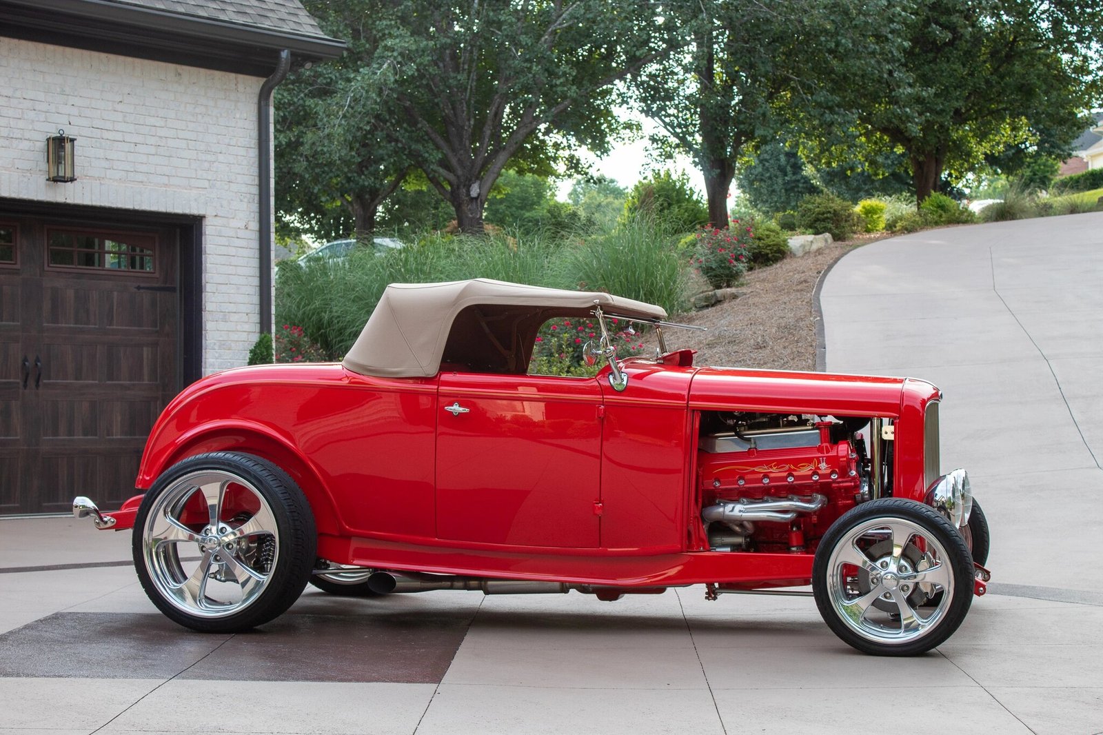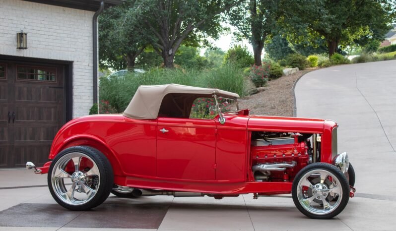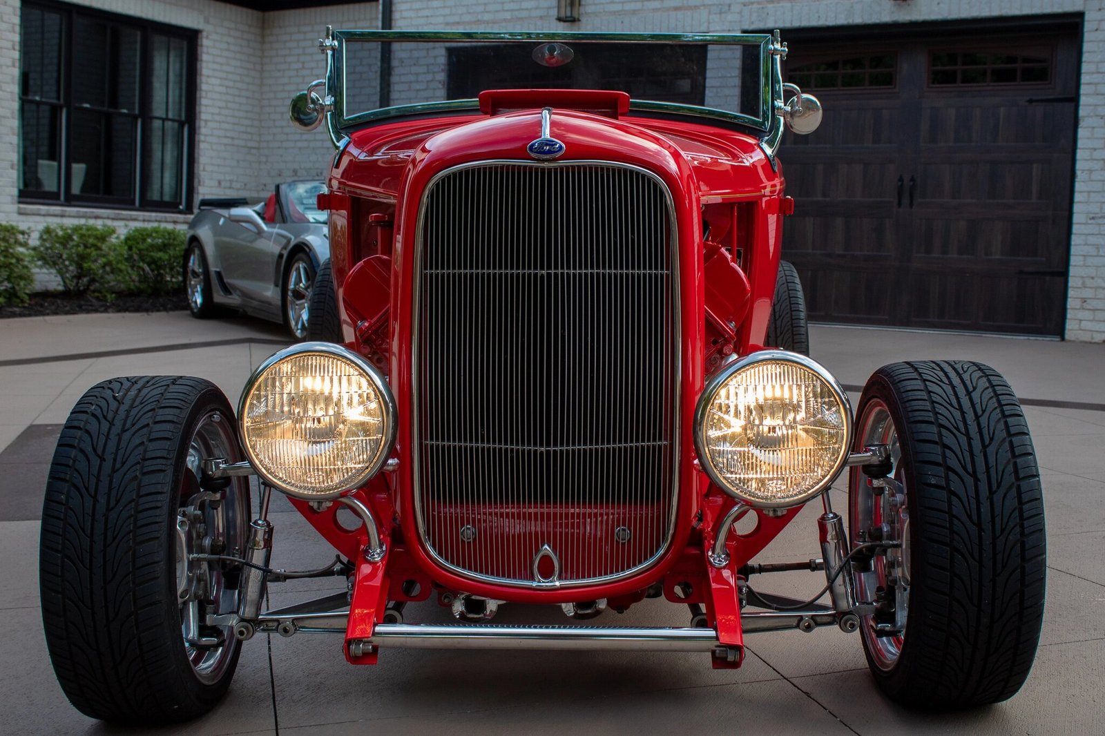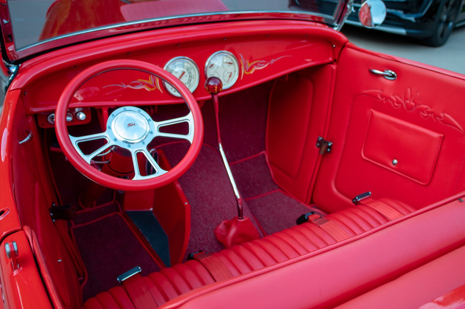 The steel Brookville Roadster body is finished in red with yellow and gray pinstriping and is mounted to a custom boxed chassis built by Gray’s Garage.
