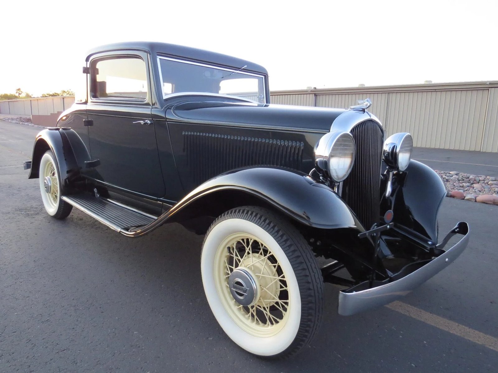The cream-painted wire wheels wear Plymouth-branded hubcaps, and they are mounted with Denman bias-ply whitewall tires.