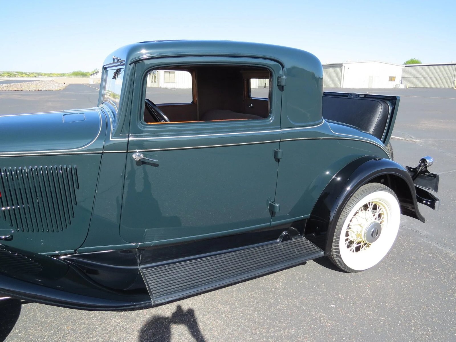 The body was repainted in factory Myll Green with black fenders during the 1980s refurbishment and features a single Plymouth-branded brake light, running boards, rear-mounted doors, and a tilt-forward windshield as well as chrome bumpers, rumble seat steps, headlight buckets, a radiator surround, and a hood ornament.