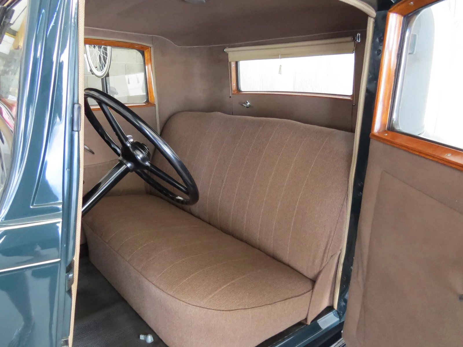 The steel dash was repainted with a walnut-style woodgrain during the refurbishment, and it houses a barrel-type speedometer and auxiliary gauges.