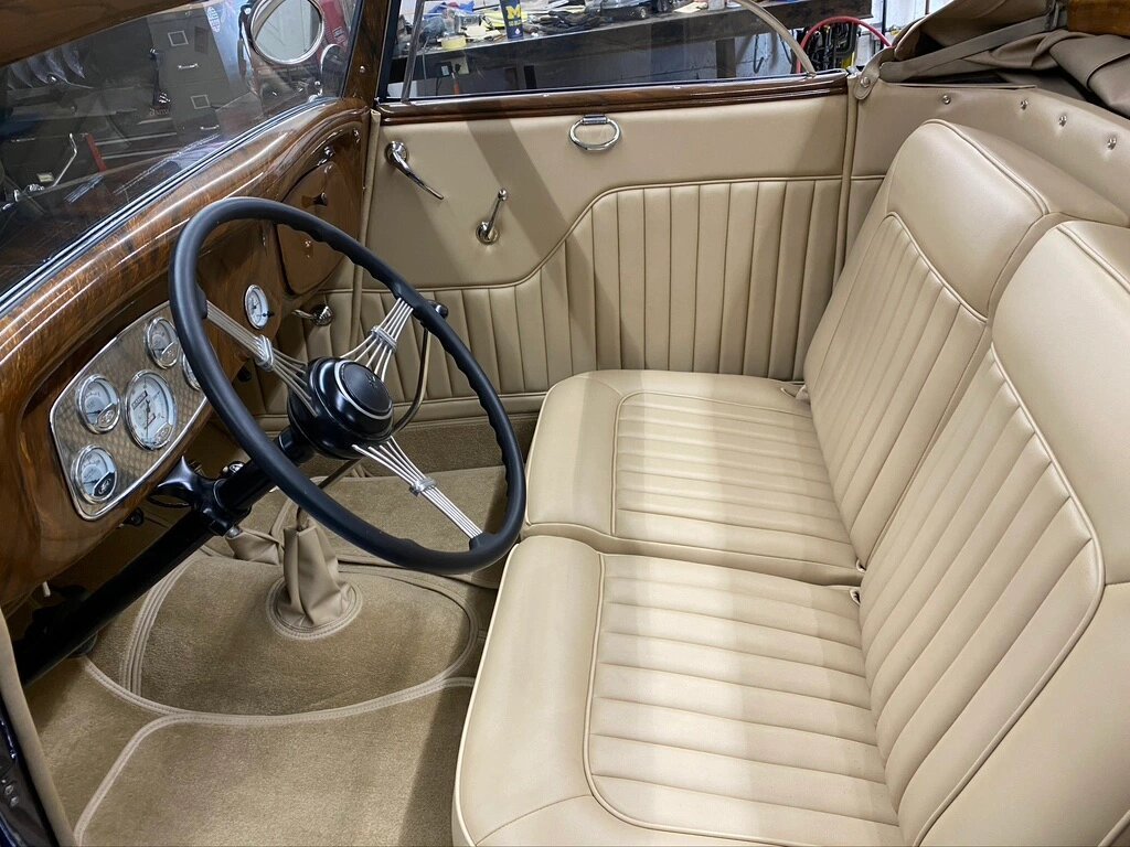 The steel dash has been refinished in faux woodgrain with a matching windshield surround and upper door trim.