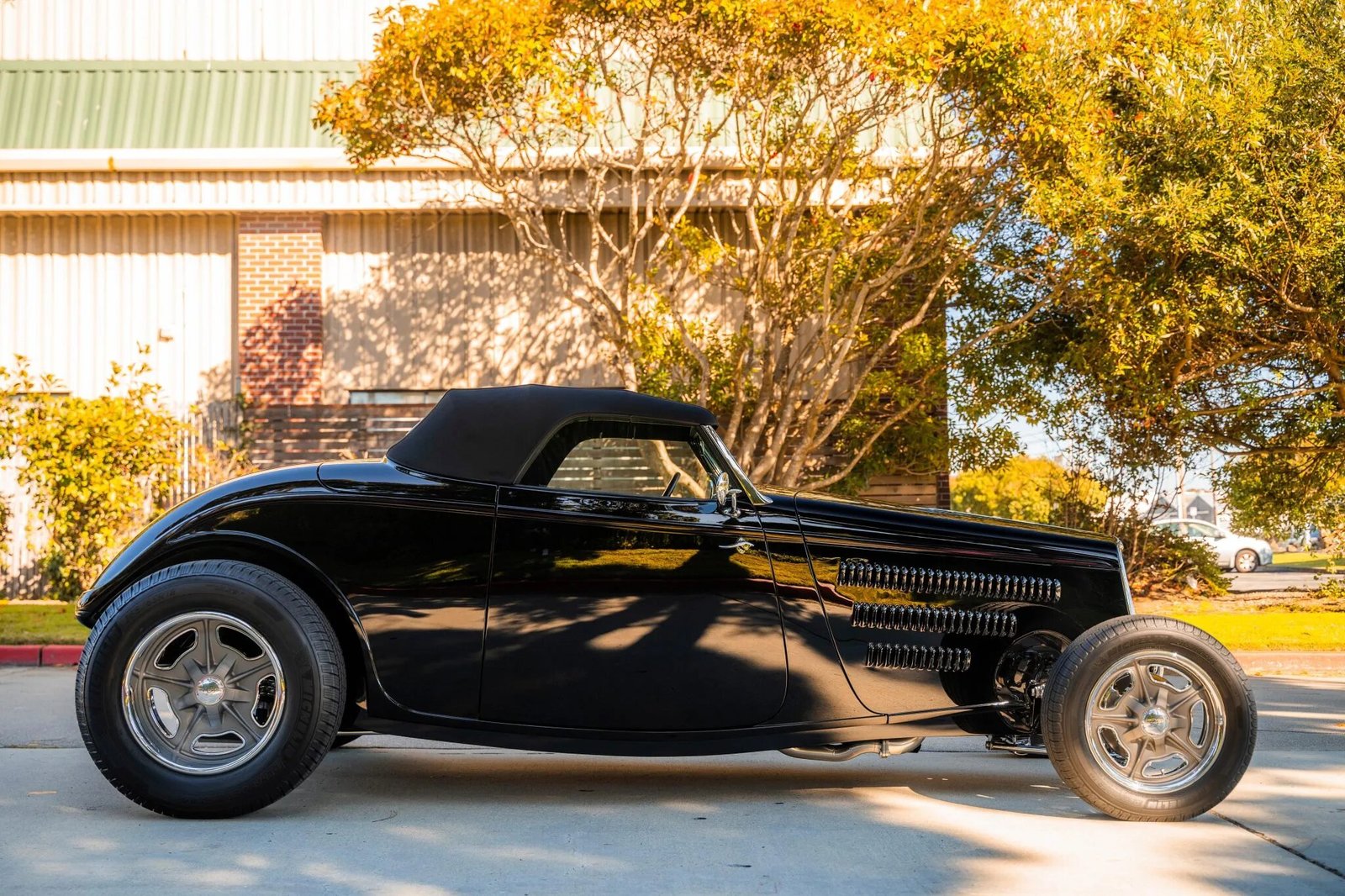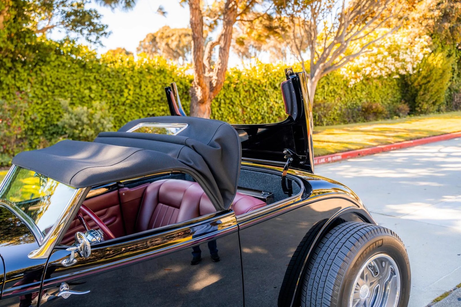 This ’33 Ford roadster was built by Roy Brizio Street Rods utilizing a steel body from American Speed Company. Completed in 2019, the car rides on a custom chassis equipped with four-wheel independent suspension from Kugel Komponents as well as four-wheel disc brakes. Power comes from a Ford Racing 302ci V8 linked to a Tremec five-speed manual transmission and a Winters quick-change rear end. The car was painted in black by Darryl Hollenbeck, and the interior was trimmed in maroon leather by Sid Chavers. Additional highlights of the build include a convertible soft top, staggered-diameter Budnik wheels, electric power steering, Vintage Air climate control, power windows, and Classic Instruments gauges.