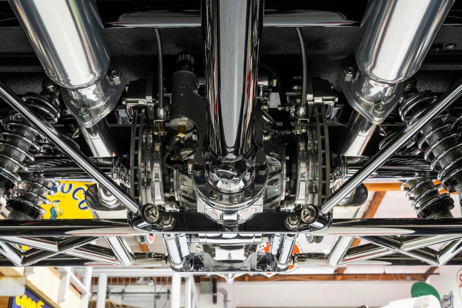 Power is sent to the rear wheels through a Tremec five-speed manual transmission, a Winters quick-change rear end, and polished axles.