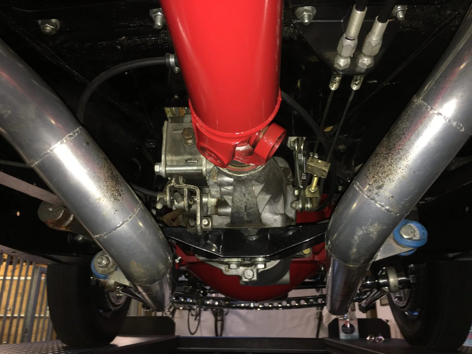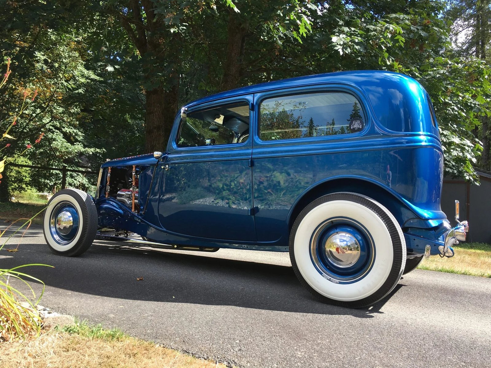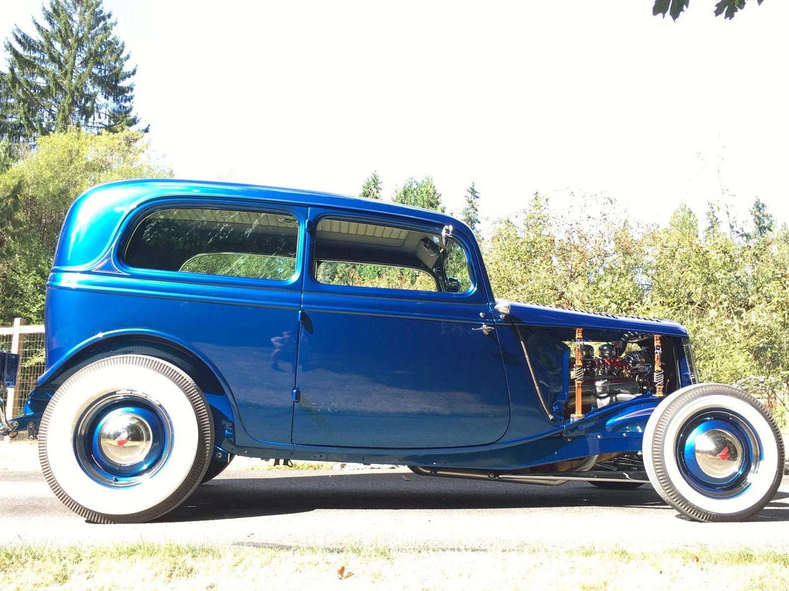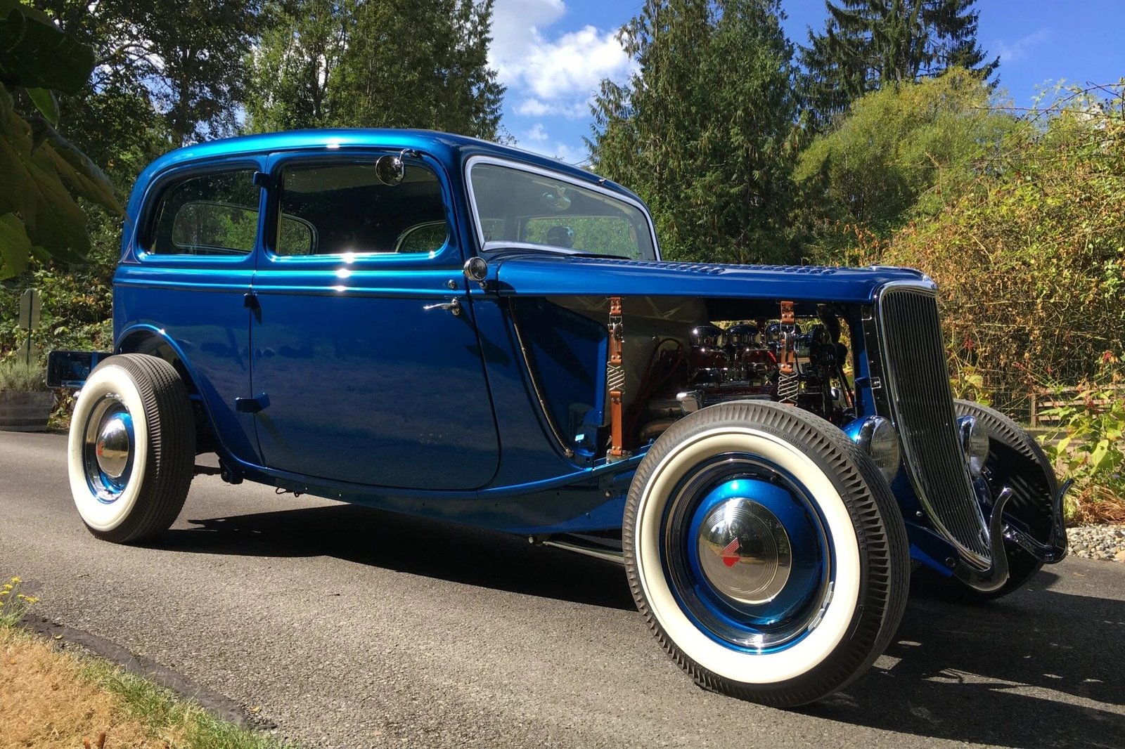 Stopping power is provided by Wilwood front discs with rear drums, and the car rides on a chrome-plated drilled and dropped front axle along with leaf springs out back.