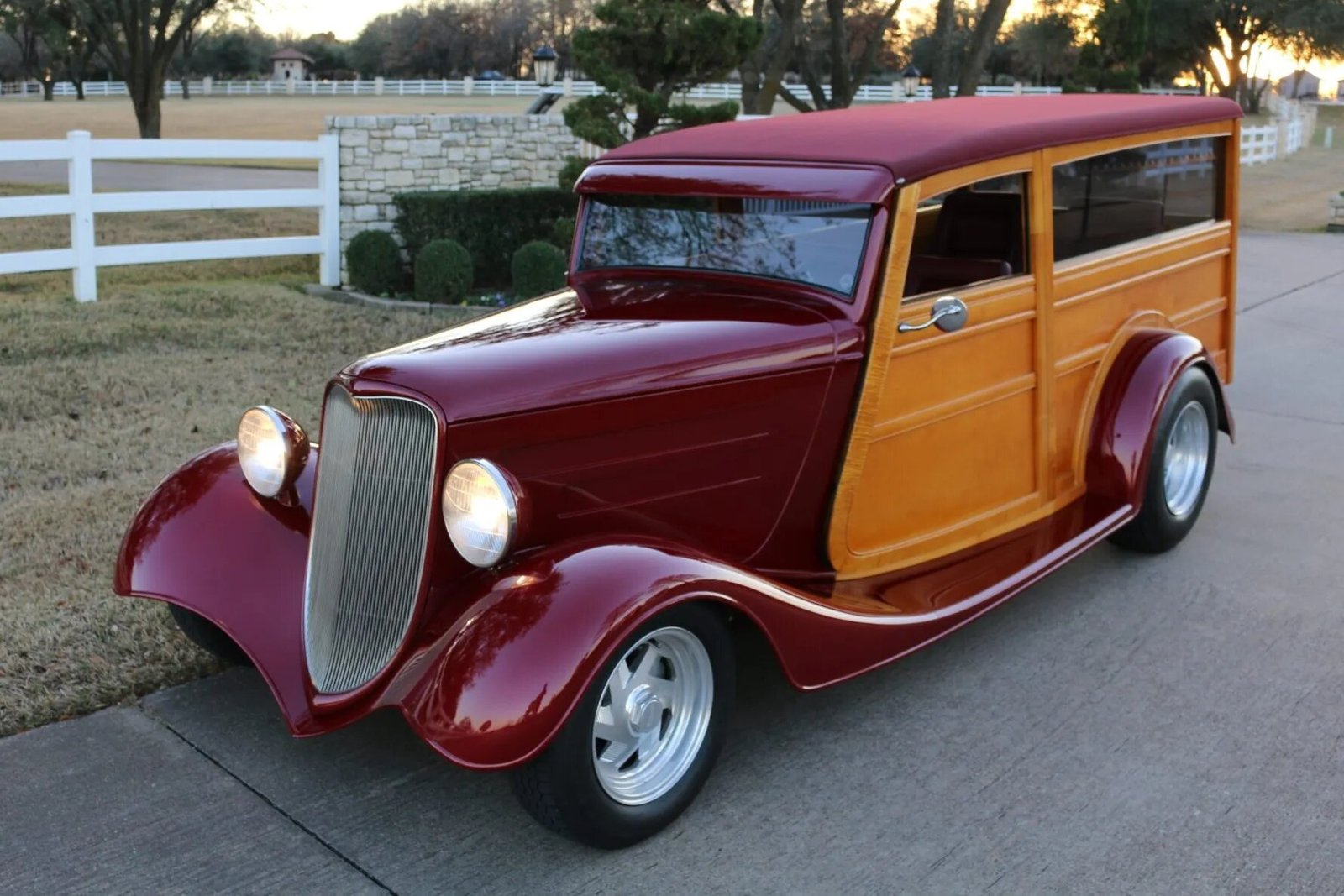 The Ford cowl received a 4” roof chop during the build and was fitted with custom two-door wagon bodywork constructed of maple and birch wood by Custom Contours of Penrose, Colorado. The car was painted a Chevrolet shade of Burnt Red Metallic and features a Rootlieb hood, a DF Metalworks grille shell, and aftermarket steel fenders and running boards that have been welded together. Additional equipment includes a red fabric roof, rear-hinged front doors, a windshield visor, tinted windows, and chrome side-view mirrors.