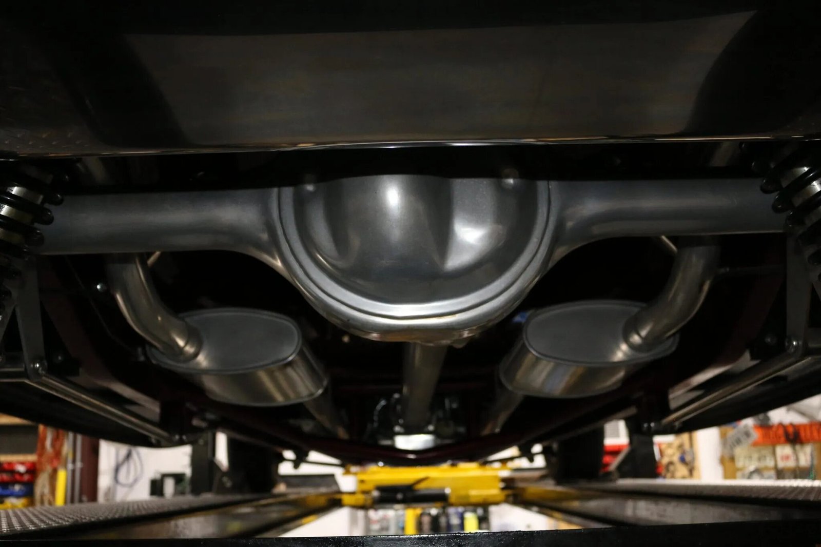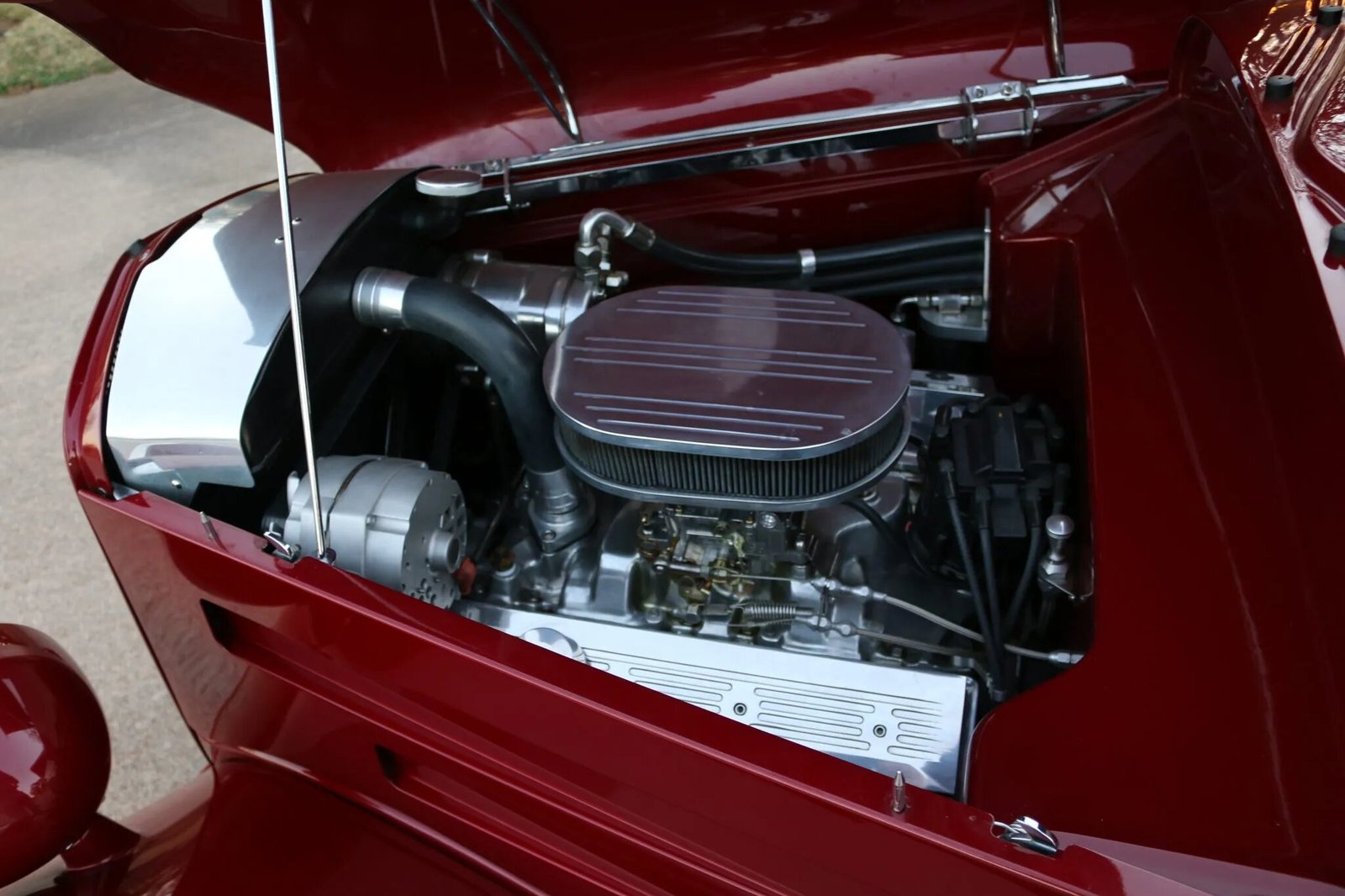 The 350ci Chevrolet V8 is equipped with a Weiand intake manifold, an Edelbrock 750-cfm carburetor, HEI ignition, headers, and a dual exhaust system with Turbo mufflers. Power is sent to the rear wheels via a Turbo-Hydramatic three-speed automatic transmission fitted with a B&M torque converter and a Ford 9” rear end housing a differential with 3.70:1 gearing. The car is fitted with a Roadster Shop Stage III Superide frame and custom steel floor pan.