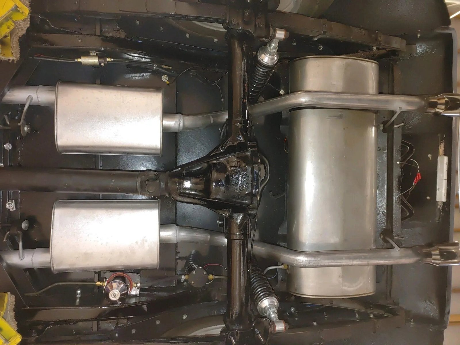The frame has been boxed and a Ford Mustang II front suspension is installed up front with drop spindles, disc brakes, and Baer tie-rods.