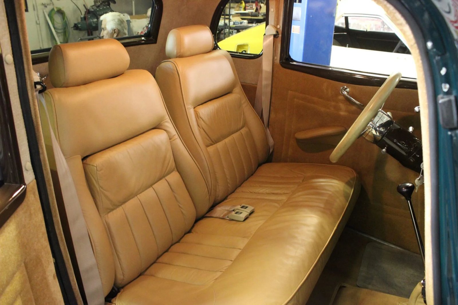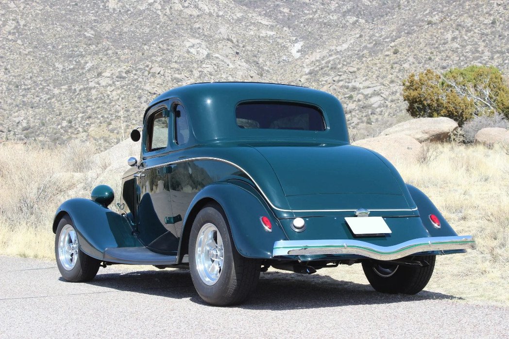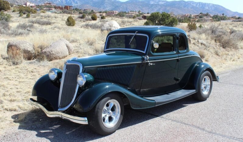 This 1934 Ford five-window is a steel-bodied coupe finished in two-tone green over tan upholstery and is powered by a 4.3-liter V6 paired with a four-speed automatic transmission.