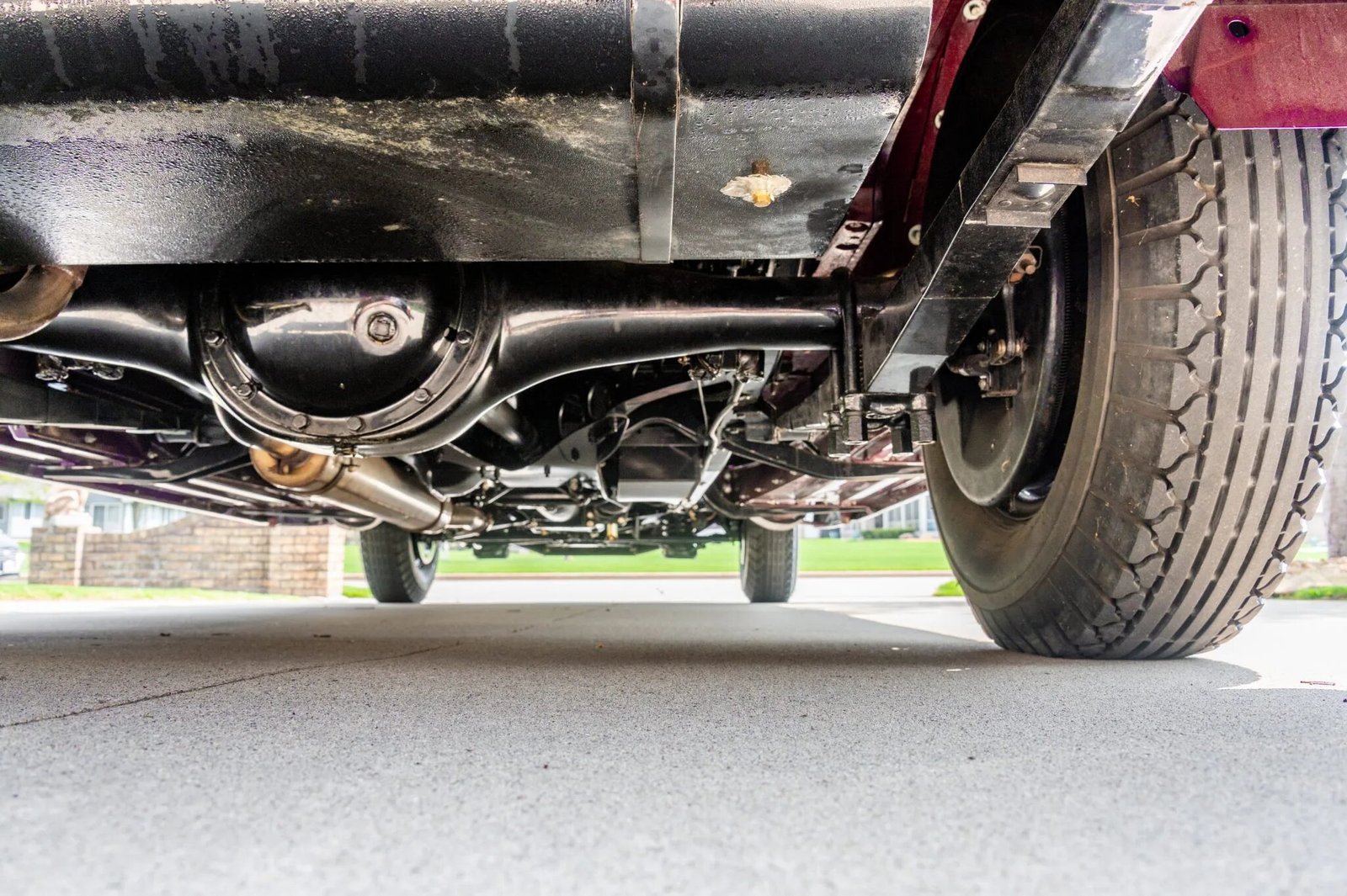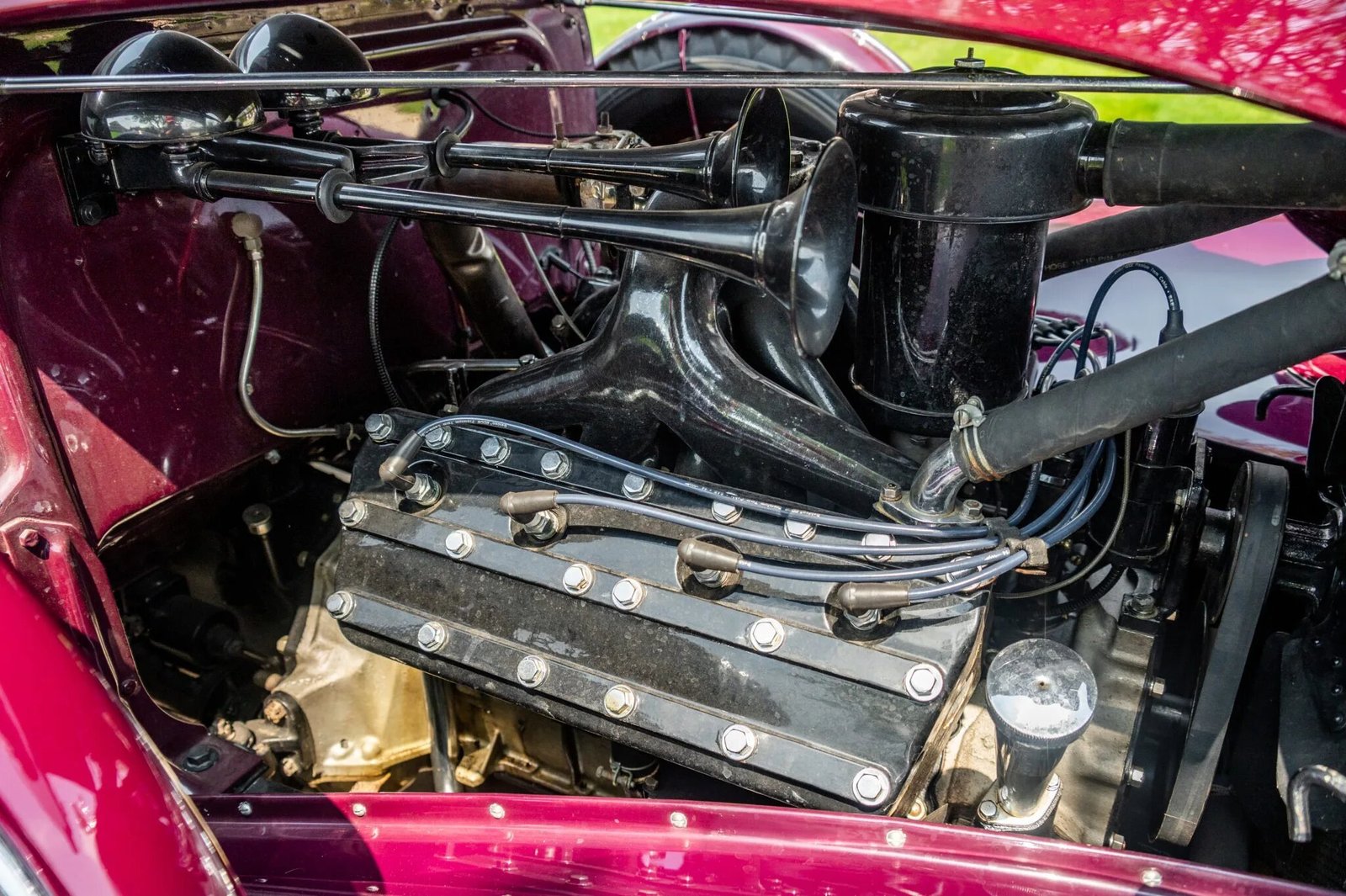 The car is finished in burgundy over gray leather upholstery, and power comes from a 353ci L-head V8 paired with a three-speed manual transmission.