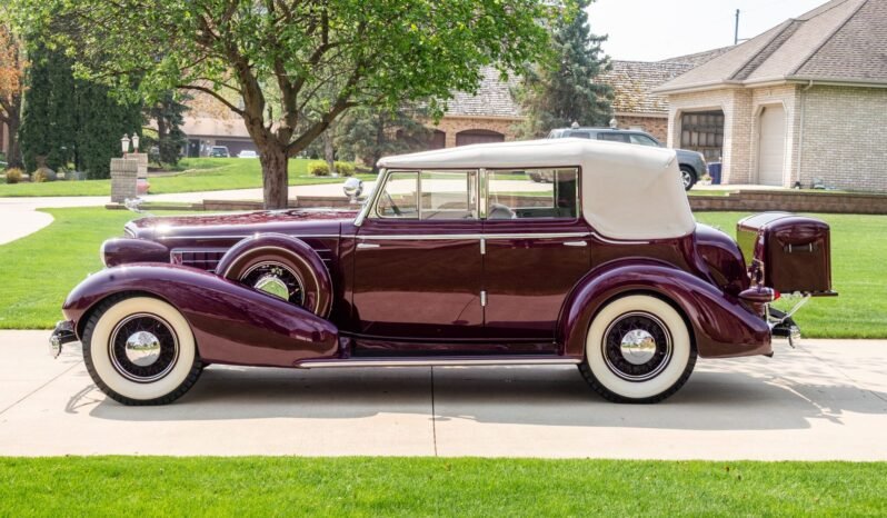 The car was repainted burgundy and features chrome bumpers, a fold-down luggage rack with a body-color trunk, dual taillights, running boards, rear-hinged front doors, a spotlight, a goddess hood ornament, driving lamps, and a gray convertible top with red piping.