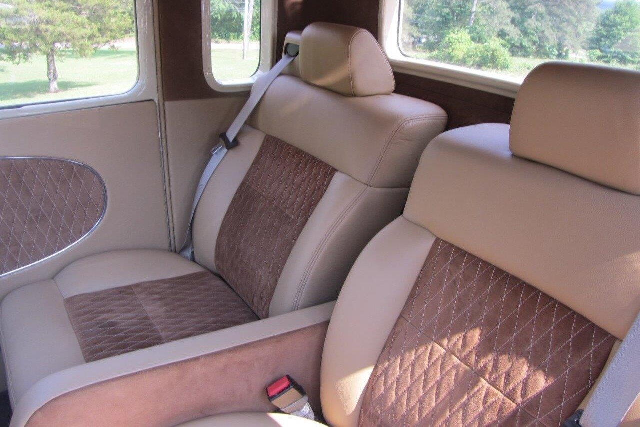 The cabin houses bucket seats trimmed in beige leather with quilted brown suede inserts and matching door panels.