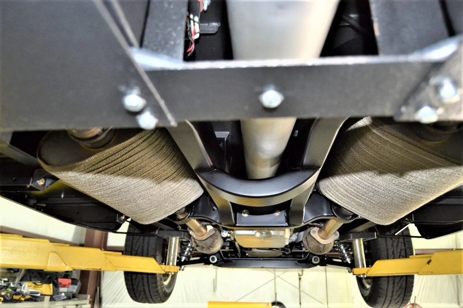 The truck rides on independent front suspension with Wilwood spindles, rear ladder bar suspension, and QA1 adjustable coilovers at all four corners.