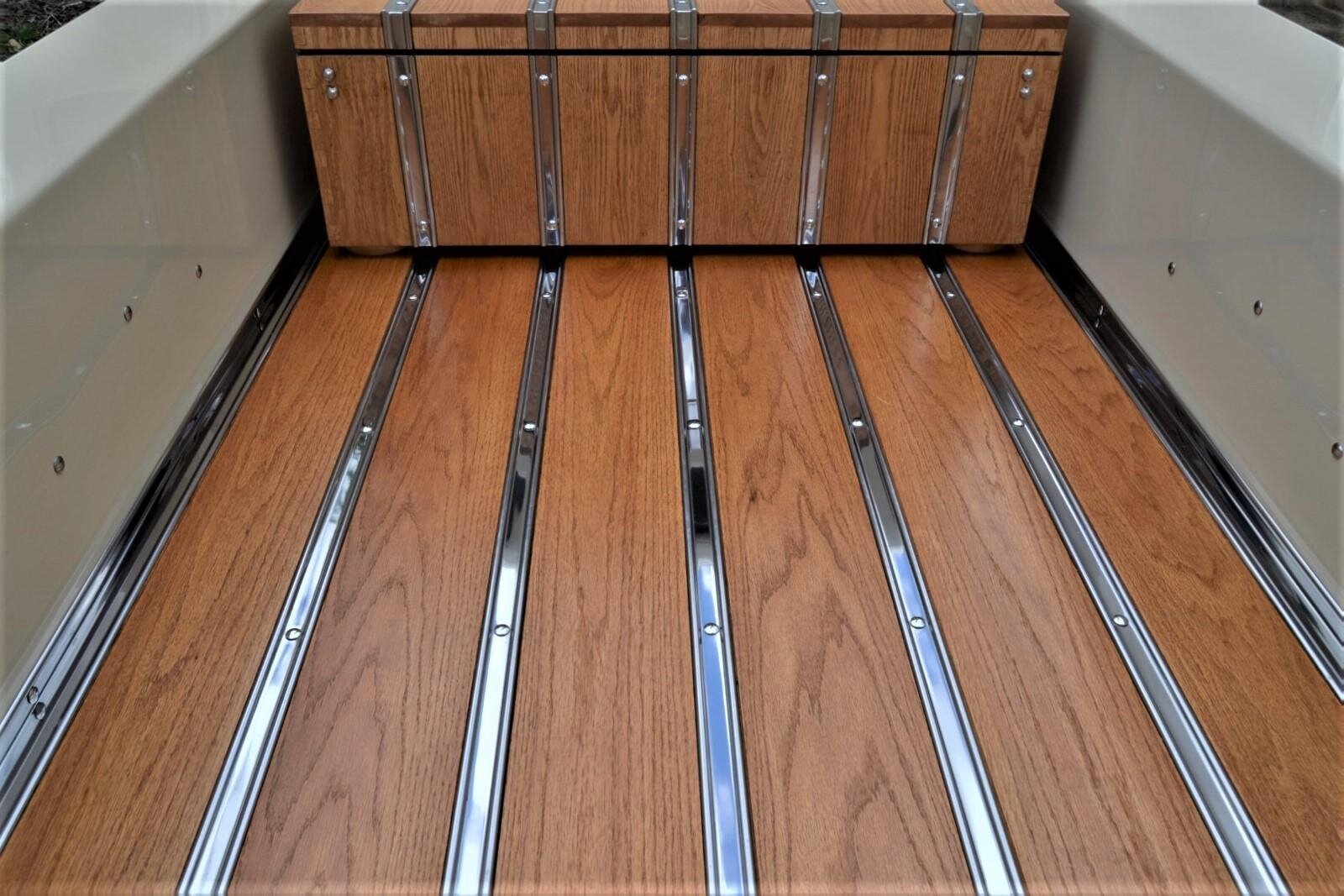 A custom hood, bed, and running boards have been installed, and a wood box with an electrically-actuated hinged top mounted inside the custom white oak-lined bed houses the battery and fuel filler neck.