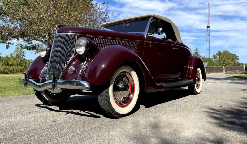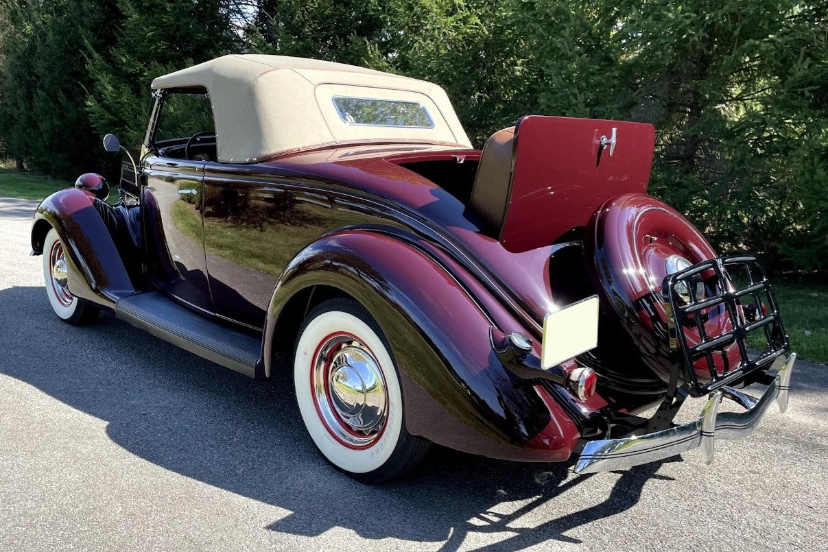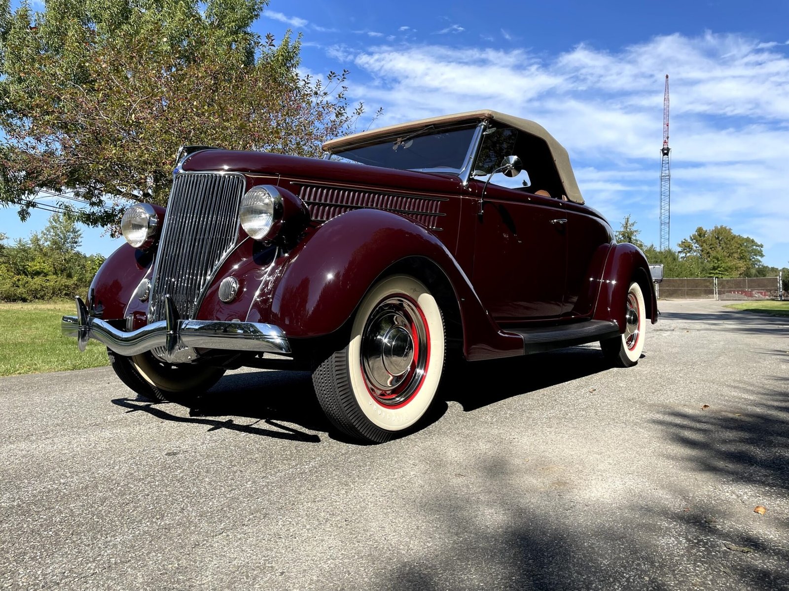 This 1936 Ford Model 68 is a Deluxe Roadster powered by a 221ci flathead V8 paired with a floor-shifted three-speed manual transmission and is finished in Light Fast Maroon with a beige soft top over brown leather upholstery. Features include a rumble seat, a Columbia two-speed rear end, fold-down rear luggage rack, chrome side mirrors, a rear-mounted spare tire cover, and red-painted steel wheels.