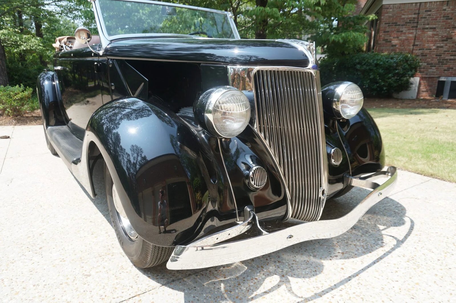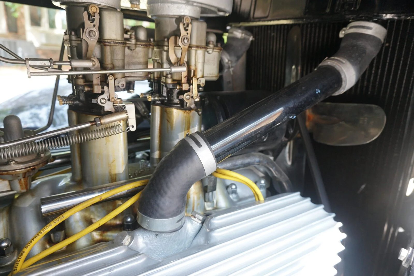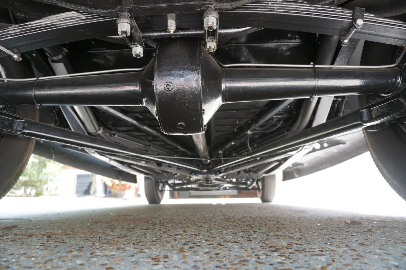 The body is finished in black over brown vinyl and powered by a 221ci flathead V8 paired with a three-speed manual transmission