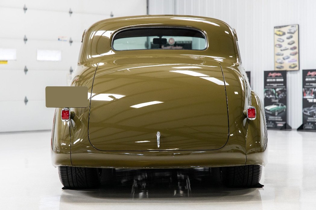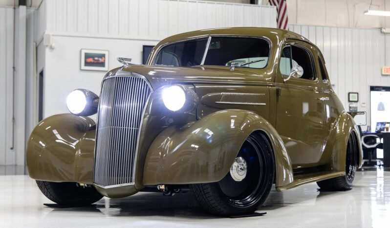 This 1937 Chevrolet Business Coupe was built by Killer Hot Rods & Customs and is powered by a 416ci LS3 V8 paired with a Tremec T-56 Magnum six-speed manual transmission. The car is finished in olive green over saddle vinyl and rides on a Street Rod Garage chassis featuring independent front suspension, power rack-and-pinion steering, Wilwood disc brakes, Strange Engineering coilover shocks, and a Ford 9″ rear end. Additional equipment includes Holley fuel injection, Hooker exhaust headers, a 3″ ceramic-coated Flowmaster exhaust system, Circle Racing aluminum wheels, Classic Instruments gauges, an Old Air Hurricane air conditioning system, and a Retrosound Bluetooth audio system. Service in preparation for the sale included changing the oil, adjusting the front ride height and trunk latch, repairing the cooling fans, headlight wiring, brake lights, exhaust system, and air conditioning system, and replacing the front brake master cylinder, clutch master cylinder, spark plugs, throttle cable, and lug nuts.