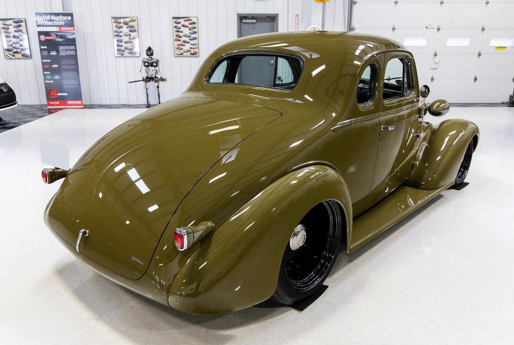 The body was modified to accommodate a Street Rod Garage chassis and refinished in olive green.