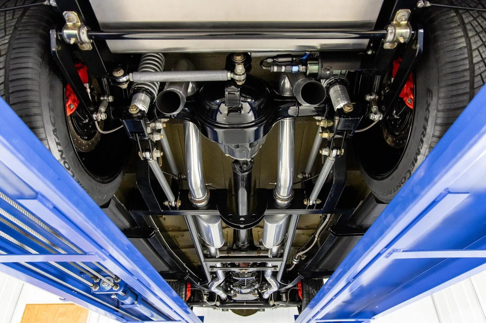 The 416ci V8 was built by Don Hardy and features body-color Chevrolet-script valve covers, a Holley Terminator X fuel injection system, Russell Performance 6AN fuel hoses and fittings, a stainless steel fuel tank, Hooker exhaust headers, a 3″ ceramic-coated stainless steel Flowmaster exhaust system, Magnaflow mufflers, an aluminum radiator, a Concept One Victory serpentine belt system, and SPAL electric fans.
