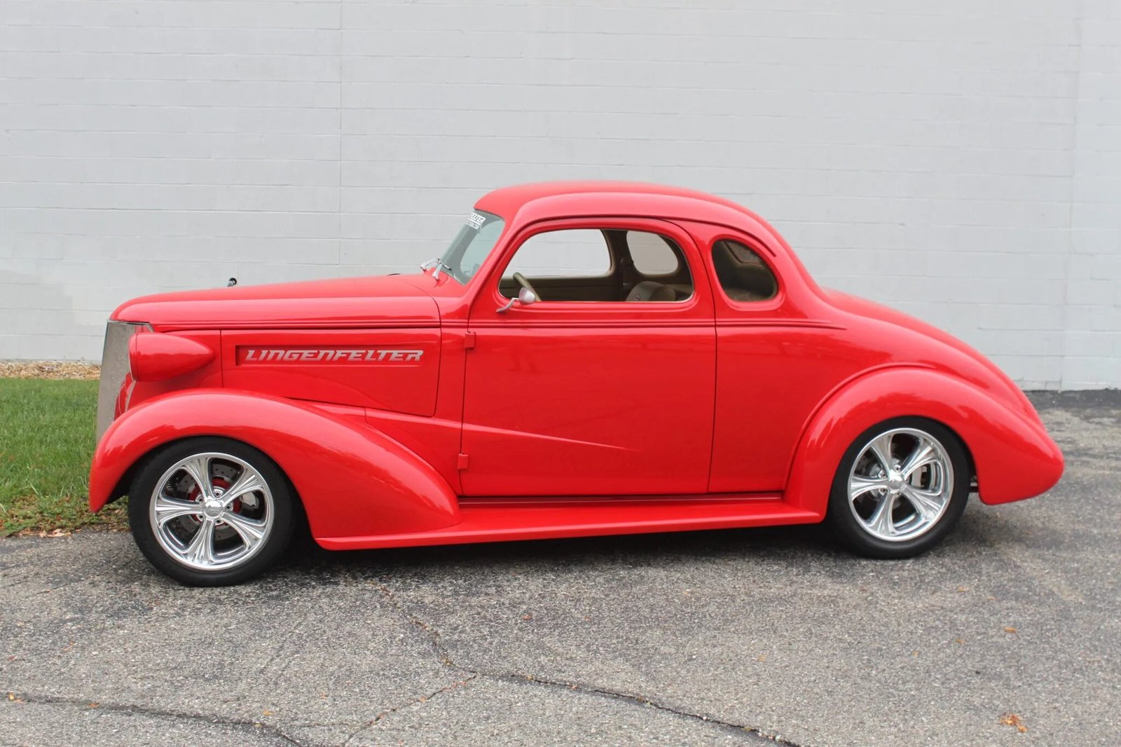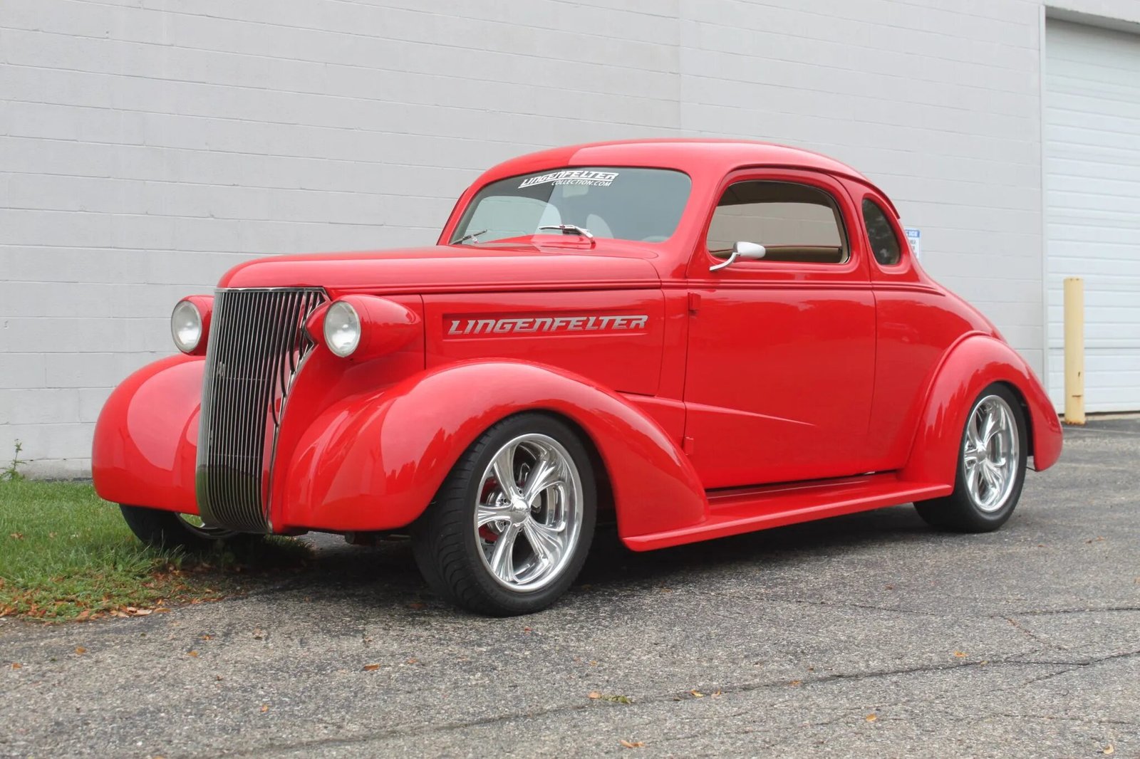 The steel 1938-style body is finished in red and features a stainless steel grille, custom headlamps, billet mirrors, shaved door and trunk handles, smoothed running boards, vertical flush-mount LED taillamps, and Grand Prix GTP-style exhaust finishers. A Lingenfelter windshield banner and side vinyl decals have been applied.