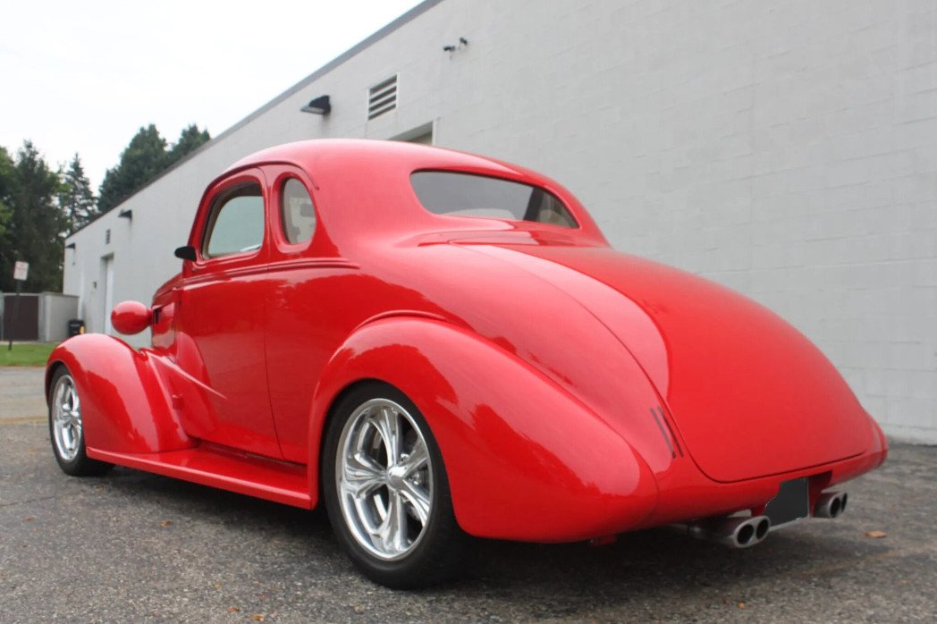 This Chevrolet Coupe street rod was refurbished and modified with work consisting of modifying and painting the body in red, trimming the interior in beige leather, and installing a Fatman Fabrications chassis, a 355ci V8, a Tremec five-speed manual transmission, and a 10-bolt rear axle. Features include a stainless-steel grille, custom headlamps, billet mirrors, shaved door handles, smoothed running boards, flush-mount taillights, power rack-and-pinion steering, power-assisted Wilwood four-wheel disc brakes, and 17″ and 18″ Boyd Coddington Crown Jewel wheels as well as a Hurst T-handle shifter, remote keyless entry, air conditioning, cruise control, a pop-out Eclipse DVD infotainment system, and power windows.