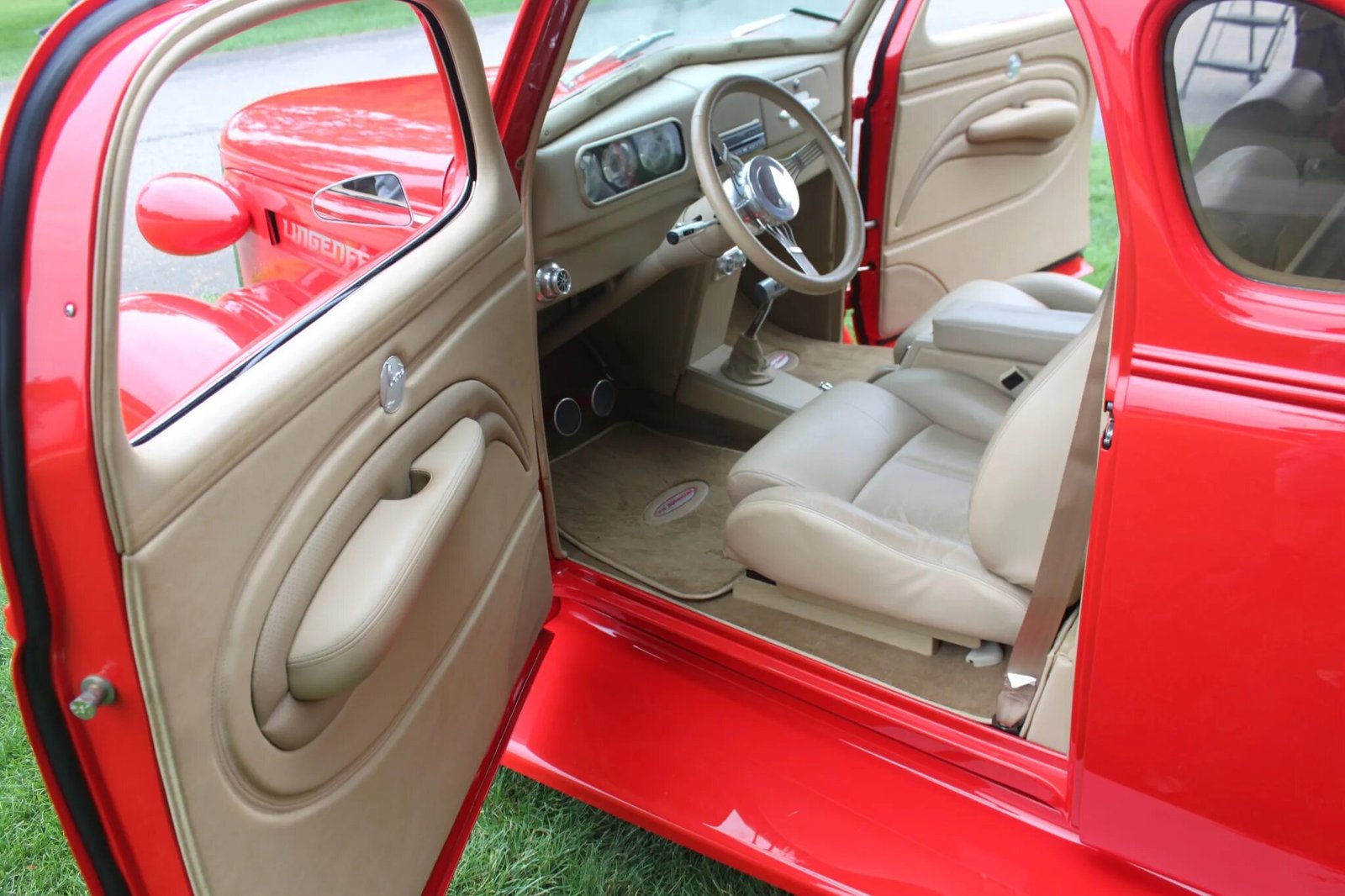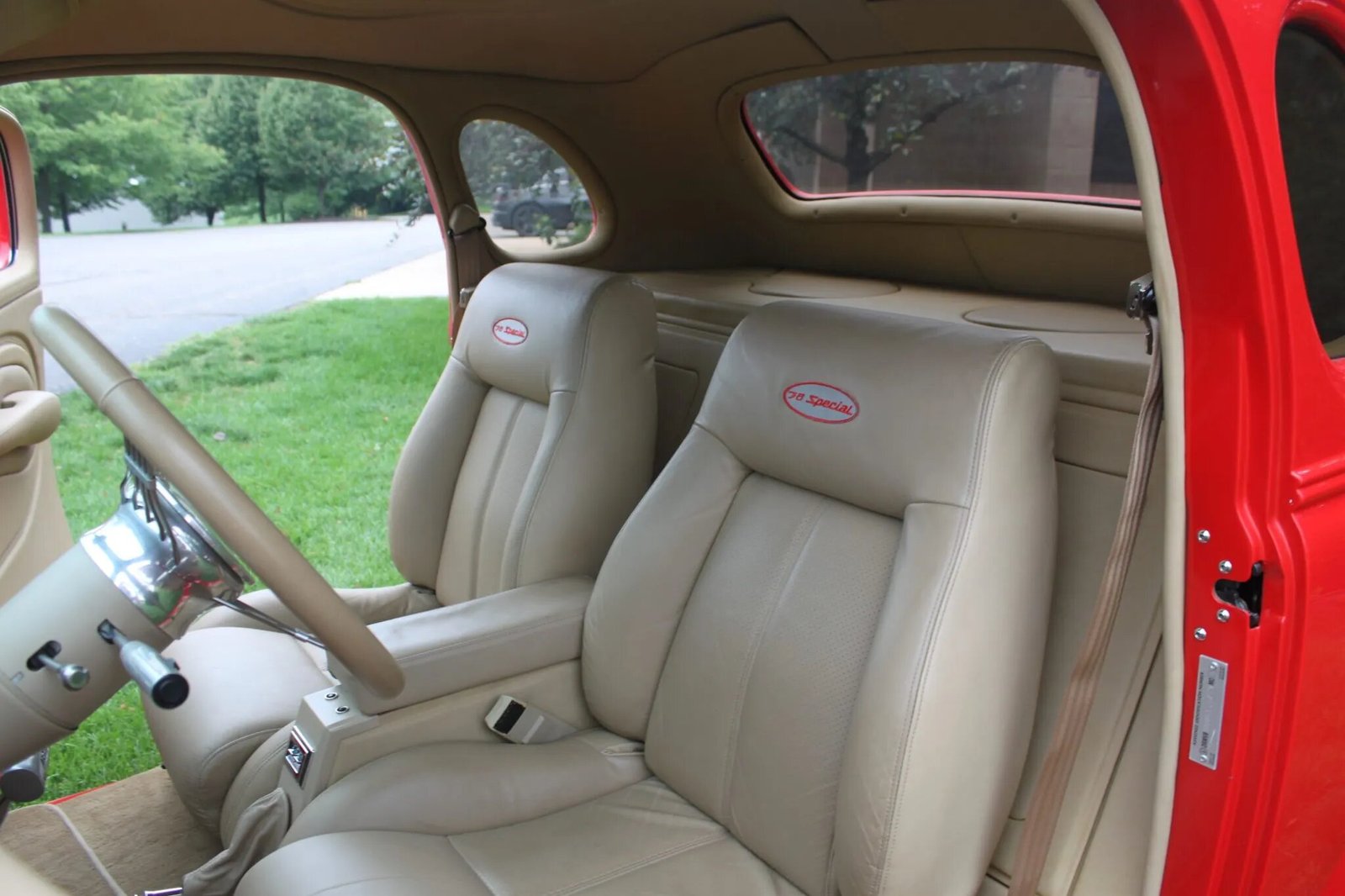 The cabin features low-back bucket seats trimmed in beige leather upholstery joined by a matching dashboard, headliner, center console, rear cargo area, and door panels. Interior details include Vintage Air climate control, cruise control, a Hurst T-handle shifter, remote keyless entry, an Eclipse pop-out infotainment system, power windows, and aluminum pedals, vents, and knobs. “’38 Special” logos are embroidered in the seat backs and floor mats and accompanied by a matching aluminum dash badge.