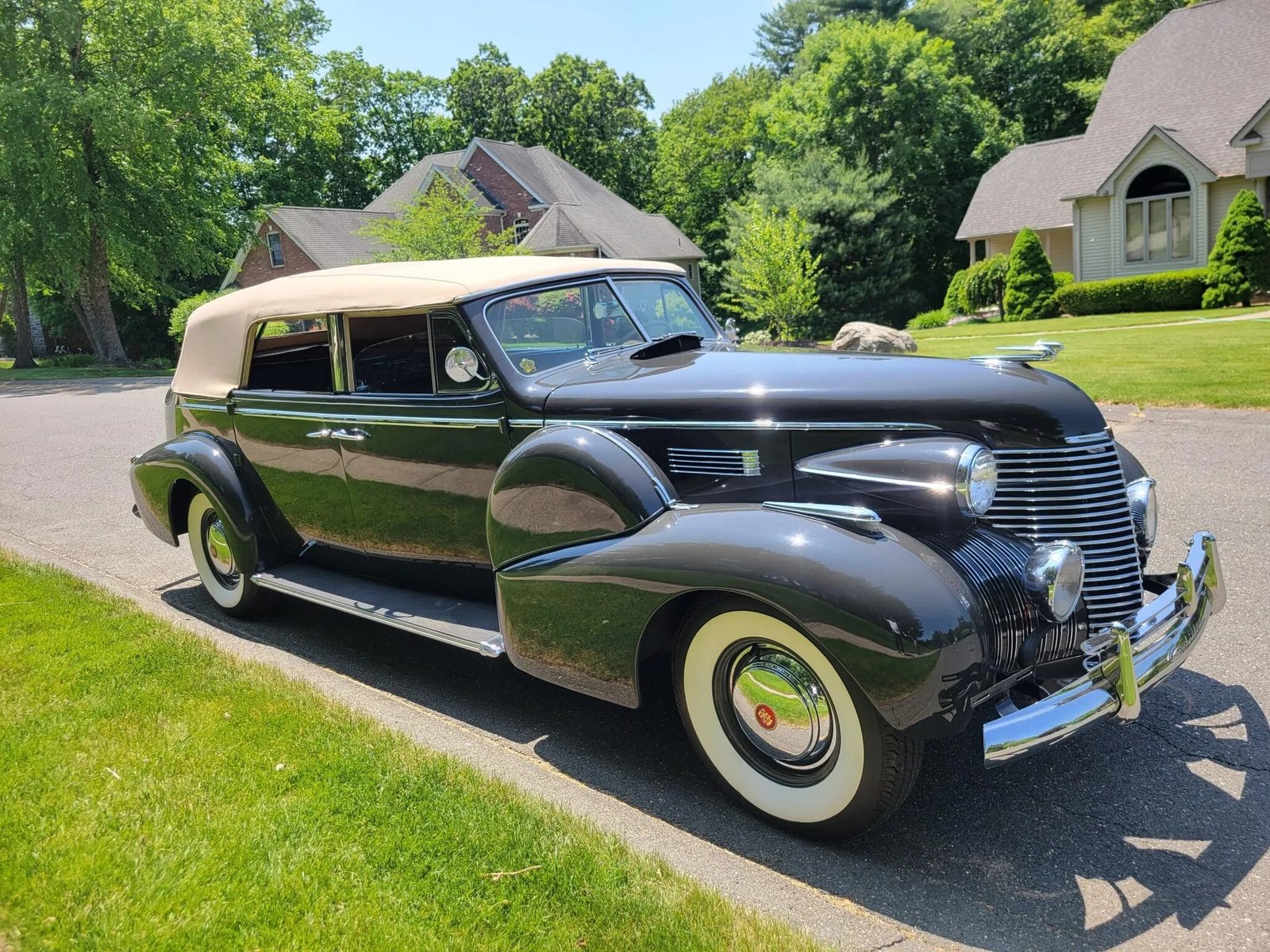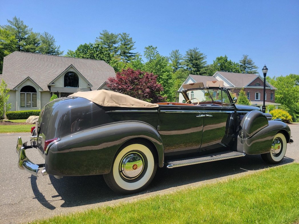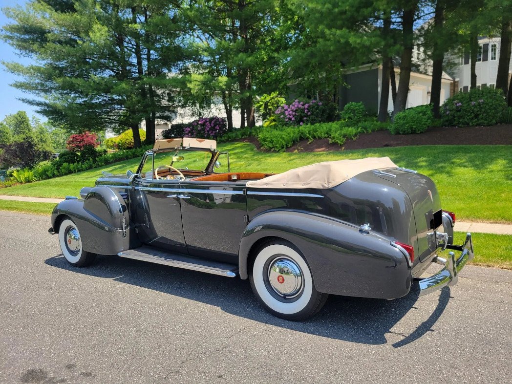 This 1940 Cadillac Series 75 is one of 45 five-place, Fleetwood-bodied convertible sedans produced for the model year and was purchased new by cosmetics company founder Elizabeth Arden. The car is finished in gray with a tan soft top, and power comes from a 346ci L-head V8 paired with a three-speed manual transmission. The cabin is partitioned and features a rear bench trimmed in brown leather along with wood trim, a hand-cranked center partition window, a clock, and heater vents, while the front cabin is equipped with gray leather upholstery, heater controls, and an AM radio. Additional equipment includes Trippe driving lights, turn signals, a goddess hood ornament, dual side-mount spare wheel covers, and detachable B-pillars.