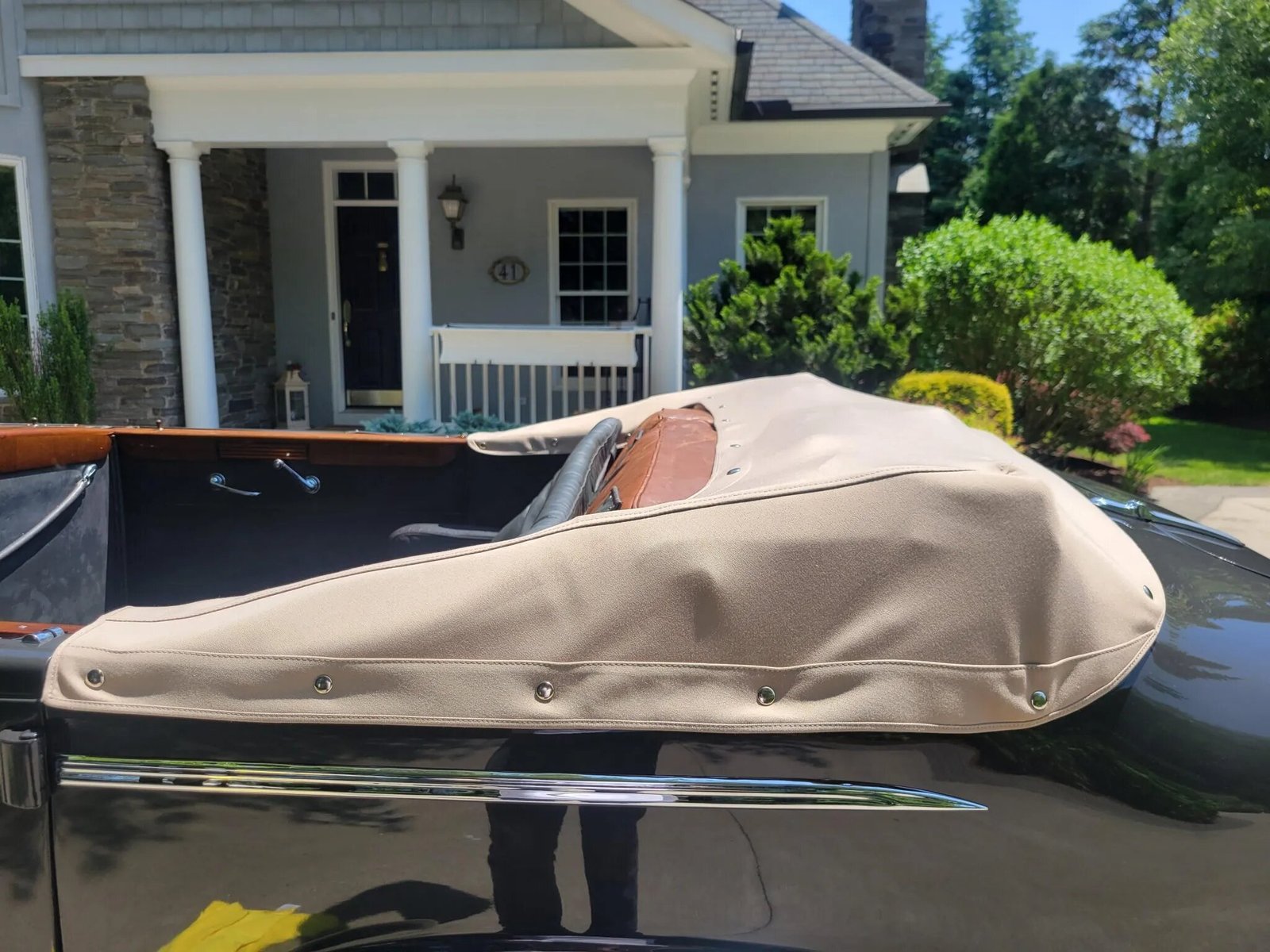 The Fleetwood-built body was repainted in its current gray and features chrome bumpers with overriders, Trippe driving lights, turn signals, a goddess hood ornament, running boards, and rear-hinged rear doors.